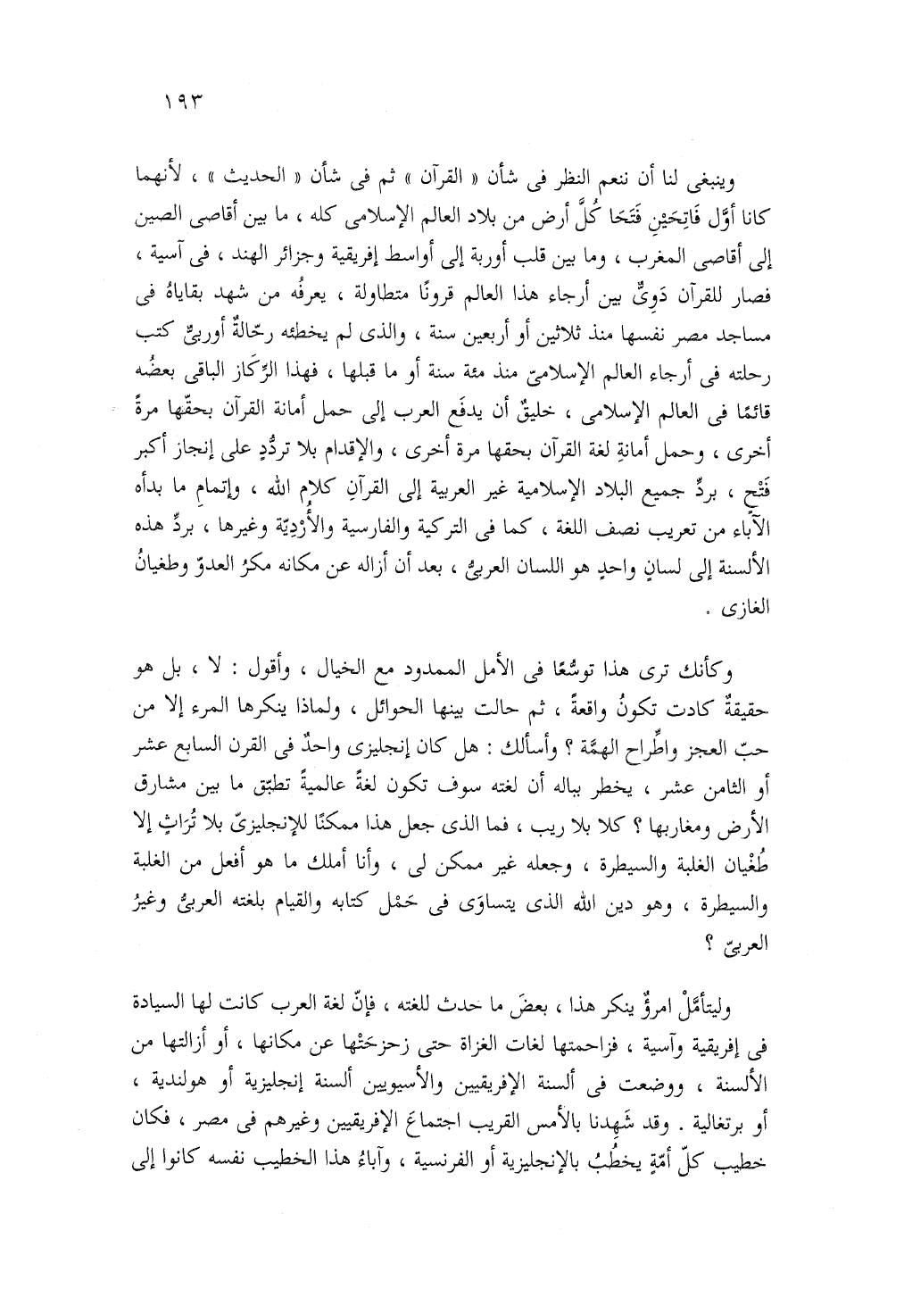وينبغى لنا أن ننعم النظر في شأن القرآن ثم في شأن الحديث لأنهما كانا أول فاتحين فتحا كل أرض من بلاد العالم الإسلامي كله ما بين أقاصى الصين إلى أقاصى المغرب وما بين قلب أوربة إلى أواسط أفريقية وجزائر الهند في آسية فصار القرآن دوى بين أرجاء هذا العالم قرونا متطاولة يعرفه من شهد بقاياه في مساجد مصر نفسها منذ ثلاثين أو أربعين سنة والذى لم يخطئه رحالة أوربي كتب رحلته في أرجاء العالم الاسلامي منذ مئة سنة أو ما قبلها فهذا الركاز الباقى بعضه قائما في العالم الإسلامي خليق أن يدفع العرب إلى حمل أمانة القرآن بحقها مرة أخرى وحمل أمانة لغة القرآن بحقها مرة أخرى والإقدام بلا تردد على إنجاز أكبر فتح برد جميع البلاد الإسلامية غير العربية إلى القرآن كلام الله وإتمام ما بدأه الآباء من تعريب نصف اللغة كما في التركية والفارسية والأردية وغيرها برد هذه الألسنة إلى لسان واحد هو اللسان العربى بعد أن ازاله عن مكانه مكر العدو وطغيان الغازي.