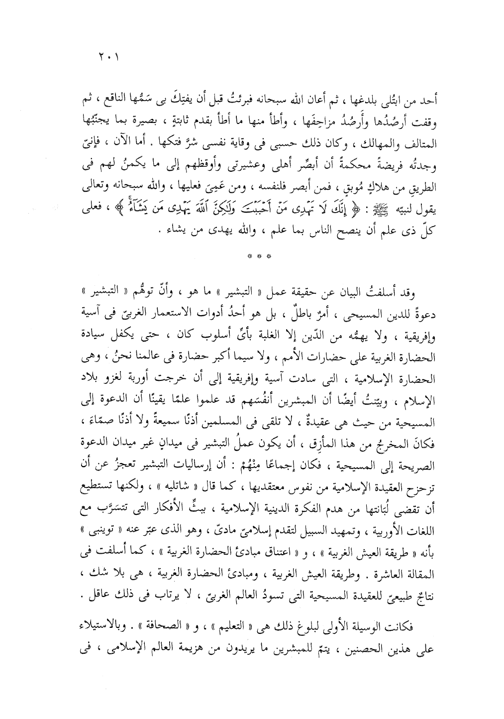 وقد أسلفت البيان عن حقيقة عمل التبشير ما هو وان توهم التبشير دعوة للدين المسيحي أمر باطل بل هو أحد أدوات الاستعمار الغربي في آسية وأفريقية ولا يهمه من الدين إلا الغلبة بأى أسلوب كان حتى يكفل سيادة الغربية على حضارات الأمم ولا سيما أكبر حضارة في عالمنا نحن وهى الحضارة الاسلامية التي سادت آسية وأفريقية إلى ان خرجت أوربة لغزو بلاد الإسلام وبينت أيضًا أن المبشرين أنفسهم قد علموا علما يقينا أن الدعوة إلى المسيحية من حيث هي عقيدة لا تلقى في المسلمين أذنا سميعة ولا آذن صماء فكان المخرج من هذا المأزق أن يكون عمل التبشير في ميدان غير ميدان الدعوة الصريحة إلى المسيحية فكان إجماع منهم أن إرساليات التبشير تعجز على أن تزحزح العقيدة الإسلامية من نفوس معتقديها كما قال شاتليه ولكنها تستطيع أن تقضى لبانتها من الفكرة الدينية الإسلامية لبث الافكار التي تتسرب مع اللغات الأوربية وتمهيد السبيل لتقدم إسلامى مادي وهو الذى عبر عنه توبيني بأنه طريقة العيش الغربية وإعتناق مبادئ الحضارة الغربية كما أسلفت في المقالة العاشرة وطريقة العيش الغربية ومبادئ الحضارة الغربية هي بلا شك نتاج طبيعى للعقيدة المسيحية التي تسود العالم الغربي لا يرتاب في ذلك عاقل.