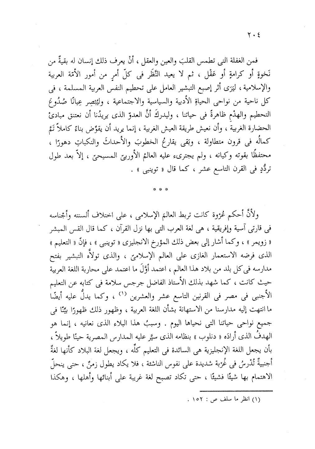 ولأن أحكم عروة كانت تربط العالم الإسلامي على أختلاف ألسنته وأجناسه في قارتى آسية وأفريقية هي لغة العرب التي بها نزل القرآن كما قال القس المبشر زويمر وكما أشار إلى بعض ذلك المؤرخ الإنجليزى توينبى فإن التعليم الذي فرضه الاستعمار الغازى على العالم الإسلامي والذى تولاه التبشير بفتح مدارسه في كل بلد من بلاد هذا العالم اعتمد أول ما اعتمد على محاربة اللغة العربية حيث كانت كما شهد بذلك الأستاذ الفاضل جرجس سلامة في كتابه عن التعليم الأجنبى في مصر في القرنين التاسع عشر والعشرين (1)، وكما يدل عليه أيضا ما انتهت إليه مدارسنا من الأستهانة بشأن اللغة العربية وظهور ذلك ظهورا بينا في جميع نواحى حياتنا التي نحياها اليوم وسبب هذا البلاء الذي نعانيه إنما هو الهدف الذي اراده دنلوب بنظامه الذي سير عليه المدارس المصرية حينا طويلا بأن يجعل اللغة الإنجليزية هي السائدة في التعليم كله ويجعل لغة البلاد كأنها لغة أجنبية تدرس في غربة شديدة على نفوس الناشئة فلا يكاد يطول زمن حتى ينحل الاهتمام بها شيئا فشيئا حتى تكاد تصبح لغة غريبة على ابنائها وأهلها، وهكذا