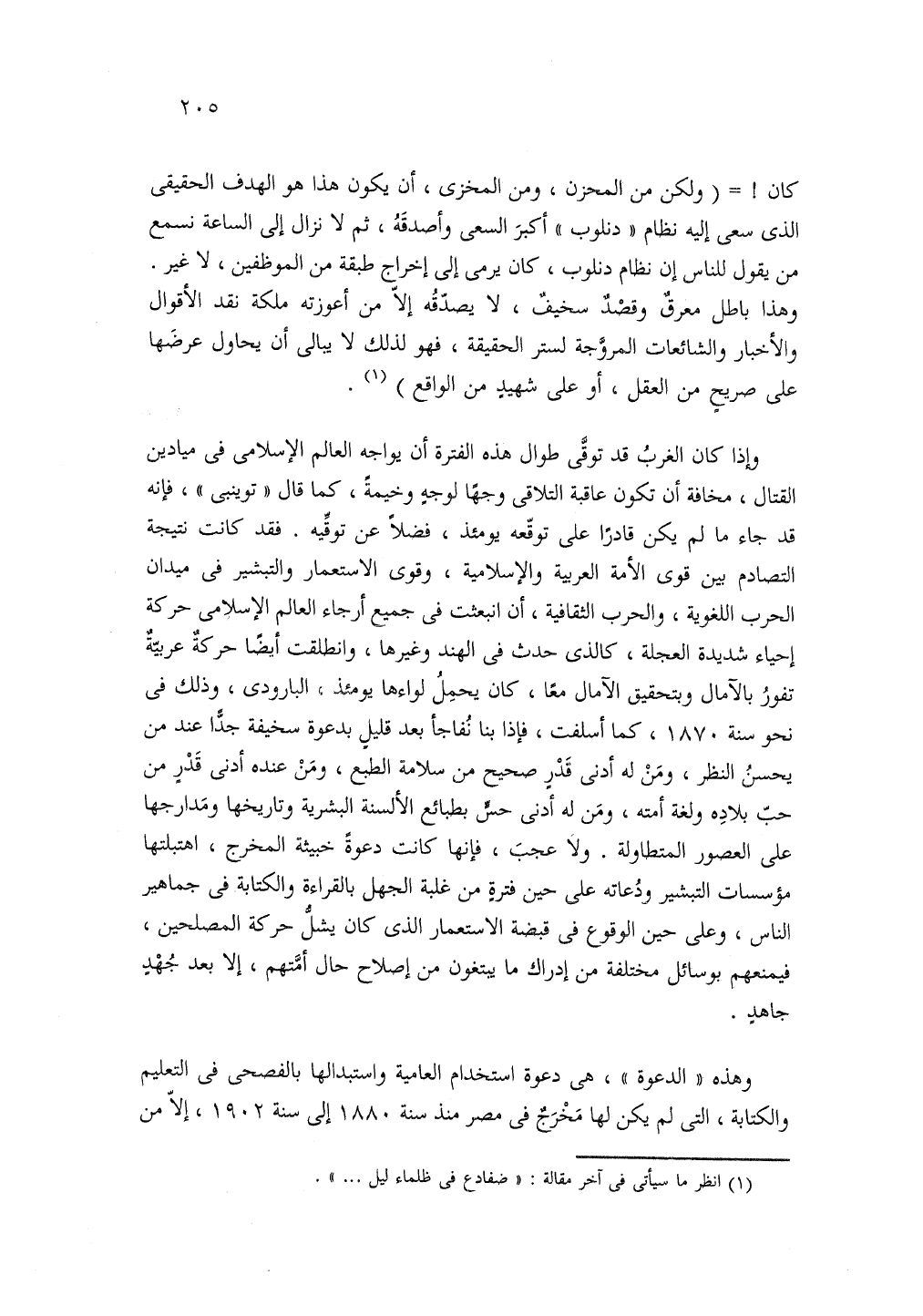 كان = (ولكن من المحزن ومن المخزى أن يكون هذا هو الهدف الحقيقى الذي سعى إليه دنلوب أكبر السعى وأصدقه ثم لا نزال إلى الساعة نسمع من يقول للناس إن نظام دنلوب كان يرمى إلى أخراج طبقة من الموظفين لا غير. وهذا باطل معرق وقصد سخيف لا يصدقه إلا من أعوزته ملكة نقد الأقوال والأخبار والشائعات المروجة لستر الحقيقة فهو لذلك لا يبالى أن يحاول عرضها على صريح من العقل أو على شهيد من الواقع) (1).