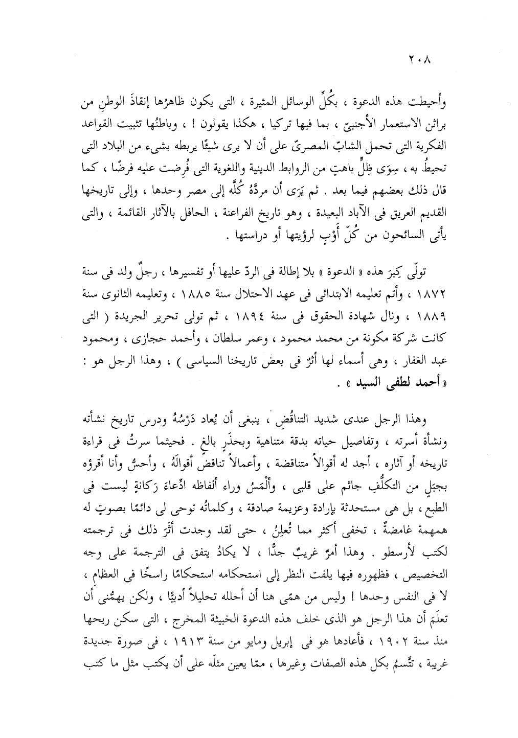 وهذا الرجل عندى شديد التناقض ينبغى ان يعاد درسه ودرس تاريخ نشأته ونشأة أسرته وتفاصيل حياته بدقة متناهية وبحذر بالغ فحيثما سرت في قراءة تاريخه أو آثاره أجد له أقوالا متناقضة وأعماله تناقض أقواله وأحس وأنا أقرؤه بحبل من التكلف جاثم على قلبي وألمس وراء الفاظه ادعاء ركانة ليست في الطبع بل هي مستحدثة بإرادة وعزيمة صادقة وكلماته توحى لى دائما بصوت له همهمة غامضة تخفى اكثر مما تعلن حتى لقد وجد أثر ذلك في ترجمته لكتب أرسطو وهذا أمر غريب جدا لا يكاد يتفق في الترجمة على وجه التخصيص فظهوره فيها يلفت النظر إلى استحكامه استحكاما راسخا في العظام لا في النفس وحدها وليس من همى هنا أن احلله تحليلا ادبيا ولكن ما يهمنى أن تعلم ان هذا الرجل هو الذي خلف هذه الدعوة الخبيثة المخرج التي سكن ريحا سنة 1902 فأعادها هو في ابريل ومايو من سنة 1913 في صورة جديدة غريبة تتسم بكل هذه الصفات وغيرها مما يعين مثله على أن يكتب مثل ما كتب