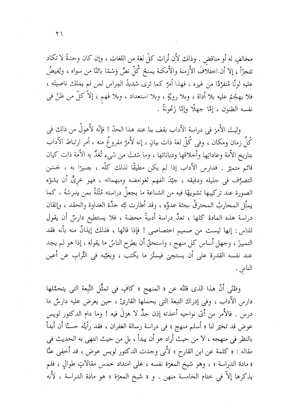 وظني أن هذا الذي قلته عن المنهج كاف في تمثل التبعة التي يتحملها دارس الآداب وفي إدارك التبعة التي يحملها القارئ حين يعرض عليه دارس ما درس فالأمر من أي نواحيه أخذته إذن جد لا هزل فيه وما دام الدكتور لويس عوض قد تخير لنا أسلم منهج في دراسة رسالة الغفران فقد رأيته حسنا أن أبدأ بالنظر في منهجه لا من حيث أراد هو أن يبدأ بل من حيث انتهى به الحديث في مقاله كلمة عن ابن القارح لأني وجدت الدكتور لويس عوض قد أخفى عنا مادة الدراسة وهو شيخ المعرة نفسه على امتداد خمس مقالات طوال فلم يذكرها إلا في ختام الخامسة منهن وشيخ المعرة هو مادة الدراسة، لأنه