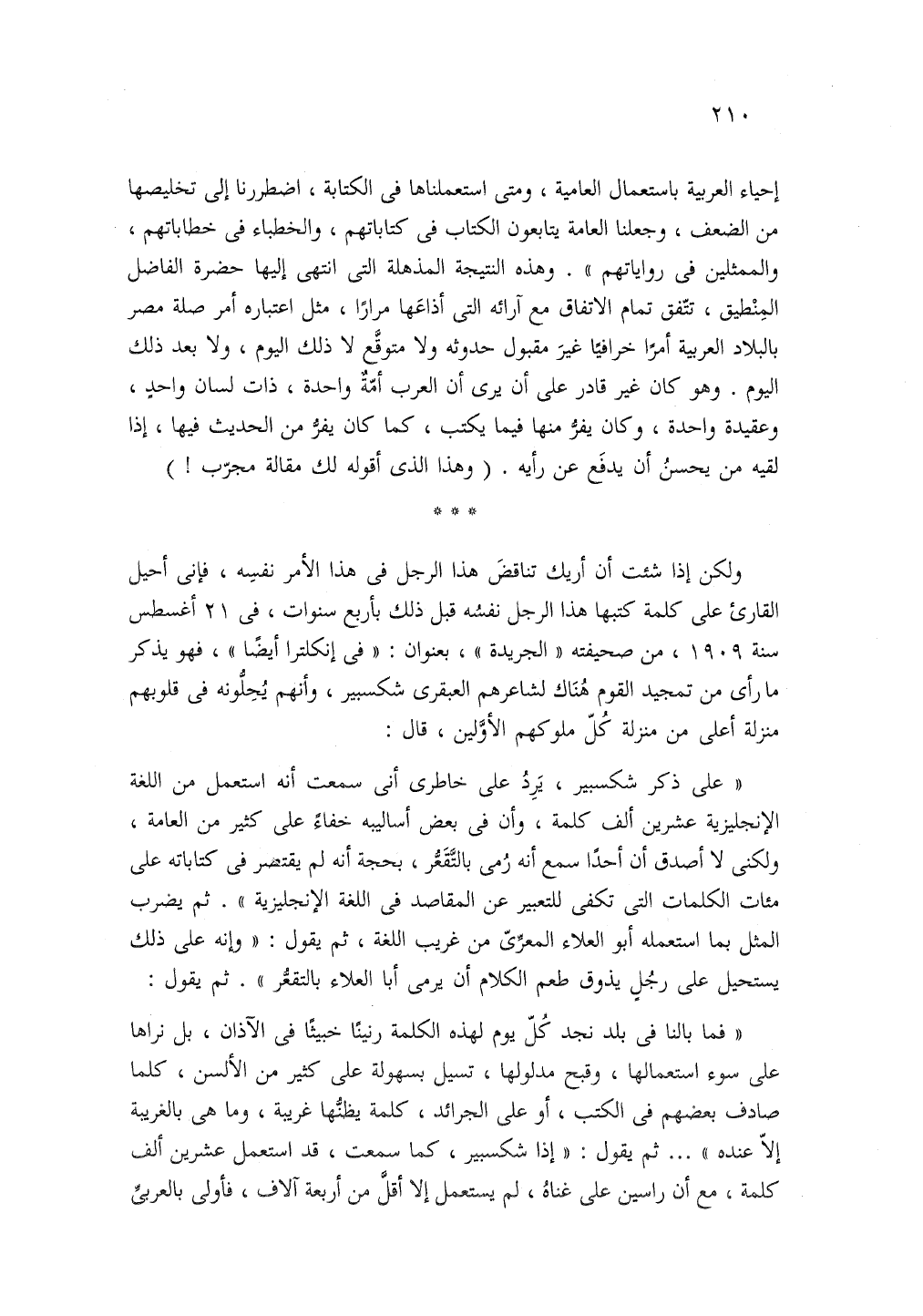 على ذكر شكسبير يرد على خاطرى انه استعمل من اللغة الإنجليزية عشرين ألف كلمة وأن في بعض أساليبه خفاء على كثير من العامة ولكنى لا أصدق ان أحدا سمع أنه رمى بالتقعر بحجة أنه لم يقتصر في كتاباته على مئات الكلمات التي تكفى للتعبير عن المقاصد في اللغة الإنجليزية. ثم يضرب المثل بما استعمله ابو العلاء المعرى من غريب اللغة ثم يقول: وإنه على ذلك يستحيل على رجل يذوق طعم الكلام أن يرمى ابا العلاء بالتقعر. ثم يقول: