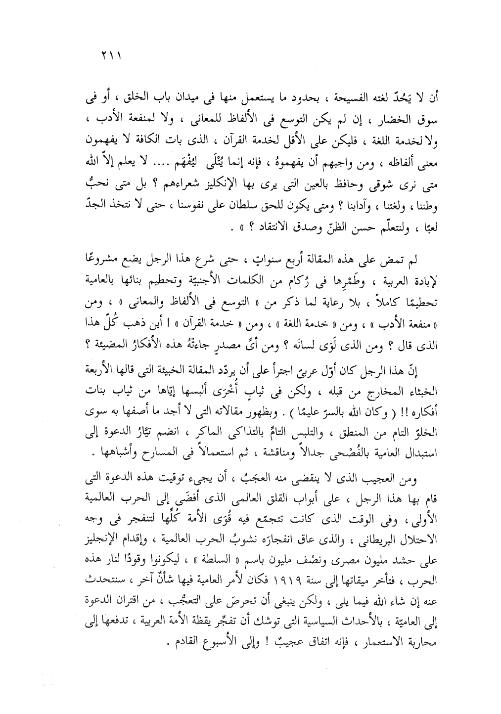 لم تمض على هذه المقالة أربعة سنوات حتى شرع هذا الرجل يضع مشروعا لإبادة العربية وطمرها في ركام من الكلمات الأجنبية وتحطيم بنائها بالعامية تحطيما كاملا بلا رعاية لما ذكر من التوسع في الألفاظ والمعانى ومن منفعة الأدب ومن خدمة اللغة ومن خدمة القرآن أين ذهب كل هذا الذي قال ومن الذى لوى لسانه ومن أي مصدر جاءته هذه الأفكار المضيئة؟