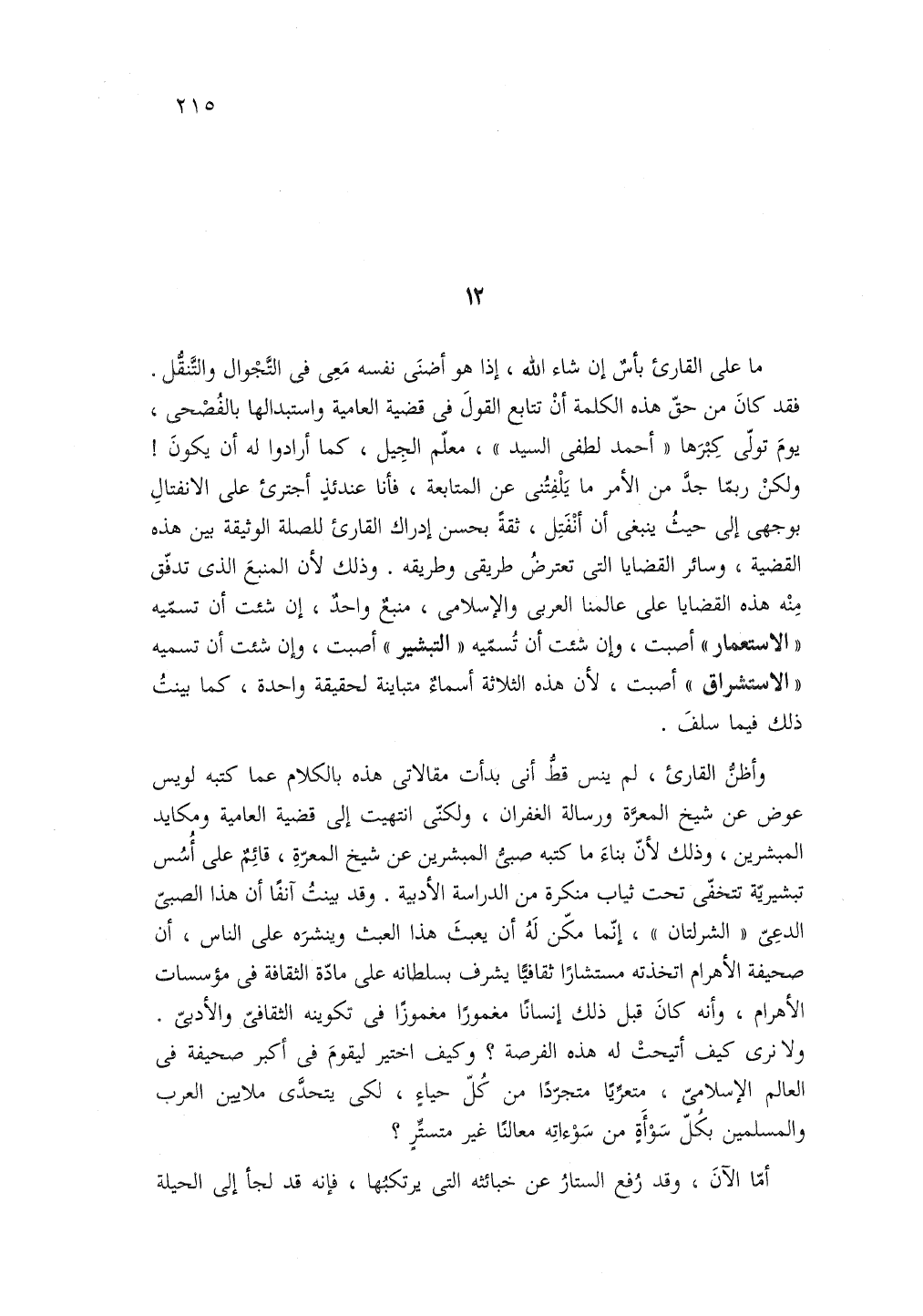 ما على القارئ بأس إن شاء الله، إذا هو أضنى نفسه معى في التجوال والتنقل فقد كان من حق هذه الكلمة أن تتابع القول في قضية العامية واستبدالها بالفصحى يوم تولى كبرها "أحمد لطفى السيد" معلم الجيل كما ارادوا له أن يكون. ولكن ربما جد في الأمر ما يلفتنى عن المتابعة فأنا عندئذ أجترئ على الانفتال بوجهى إلى حيث ينبغى أن انفتل ثقة بحسن إدراك القارئ للصلة الوثيقة بين هذه القضية وسائر القضايا التي تعترض طريقى وطريقه وذلك لأن المنبع الذى تدفق منه هذه القضايا على عالمنا العربى والإسلامي منبع واحد إن شئت أن تسميه الاستعمار أصبت وإن شئت أن تسميه التبشير اصبت وإن شئت أن تسميه الاستشراق أصبت لأن هذه الثلاثة أسماء متباينة لحقيقة واحدة كما بينت ذلك فيما سلف.