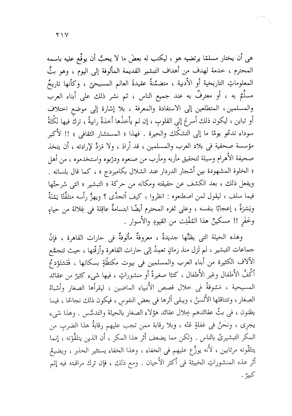 وهذه الحيلة التي يظنها جديدة معروفة ومألوفة في حارات القاهرة فإن جماعات التبشير لم تزل منذ زمان تعمد إلى حارات القاهرة وأزقتها حيث تتجمع الآلاف من أبناء العرب والمسلمين في بيوت مكتظة بسكانها فتستودع أكف الاطفال وغير الاطفال كتبا صغيرة أو منشورات فيها شيء كثير من عقائد المسيحية مسوقة من خلال قصص الأنبياء الماضين ليقرأها الصغار وأشباه الصغار وتتناقلها الألسن ويبقى أثرها في بعض النفوس فيكون ذلك نجاحا فيما يظنون في بث عقائدهم خلال عقائد هؤلاء الصغار بالحيلة والتدسيس. وهذا شيء يجرى ونحن في غفلة عنه وبلا رقابة ممن تجب عليهم رقابة هذا الضرب من المكر التبشيري بالناس. ولكن مما يضعف أثر هذا المكر أن الذين يتلقونه إنما يتلقونه مرتابين لأنه يوزع عليهم في الخفاء وهذا الخفاء يستثير الحذر ويضيع أثر هذه المنشورات الخبيثة في أكثر الأحيان ومع ذلك فإن ترك مراقبته فيه إثم كبير.