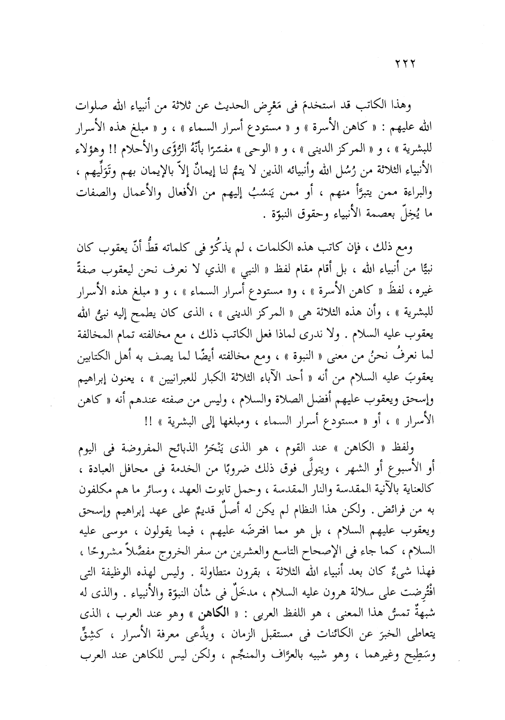 ولفظ الكاهن عند القوم هو الذى ينحر الذبائح المفروضة في اليوم أو الأسبوع أو الشهر ويتولى فوق ذلك ضروبا من الخدمة في محافل العبادة كالعناية بالآنية المقدسة والنار المقدسة وحمل تابوت العهد وسائر ما هم مكلفون به من فرائض. ولكن هذا النظام لم يكن له أصل قديم على عهد إبراهيم وإسحق ويعقوب عليهم السلام بل هو مما افترضه عليهم فيما يقولون موسى عليه السلام كما جاء في الاصحاح التاسع والعشرين من سفر الخروج مفصلا ومشروحا فهذا شيء كان بعد أنبياء الله الثلاثة بقرون متطاولة وليس لهذه الوظيفة التي افترضت على سلالة هرون عليه السلام مدخل في شأن النبوة والأنبياء والذى له شبهه تمس هذا المهنى هو اللفظ العربى الكاهن وهو عند العرب الذي يتعاطى الخبر عن الكائنات في مستقبل الزمان ويدعى معرفى الأسرارا كشق وسطيح وغيرهما وهو شبيه بالعراف والمنجم ولكن ليس للكاهن عند العرب