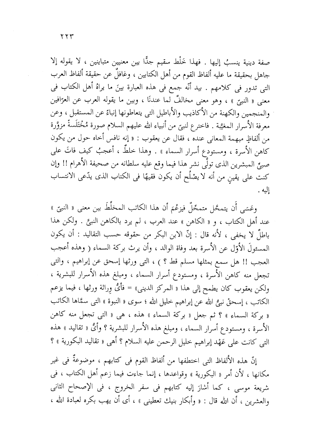 صفة دينية ينسب إليها فهذا خلط سقيم جدا بين معنيين متبانيين لا يقوله إلا جاهل بحقيقة ما عليه ألفاظ القوم من أهل الكتابين وغافل عن حقيقة ألفاظ العرب التي تدور في كلامهم. بيد أنه جمع في هذه العبارة بين ما يراه أهل الكتاب في معنى النبى وهو معنى مخالف لما عندنا وبين ما يقول العرب عن العرافين والمنجمين والكهنة من الأكاذيب والأباطيل التي يتعاطونها إنباء عن المستقبل وعن معرفة الأسرار المغيبة. فاخترع لنبى من أنبياء الله عليهم السلام صورة مختلسة مزورة من ألفاظ مبهمة المعانى عنده فقال عن يعقوب: إنه نافس أخاه حول من يكون كاهن الأسرة ومستودع أسرار السماء. وهذا خلط أعجب كيف فات على صبى المبشرين الذى تولى نشر هذا فيما وقع عليه سلطانه من صحيفة الأهرام. وإن كنت على يقين من أنه لا يصلح أن يكون فقيها في الكتاب الذي يدعى الانتساب اليه.