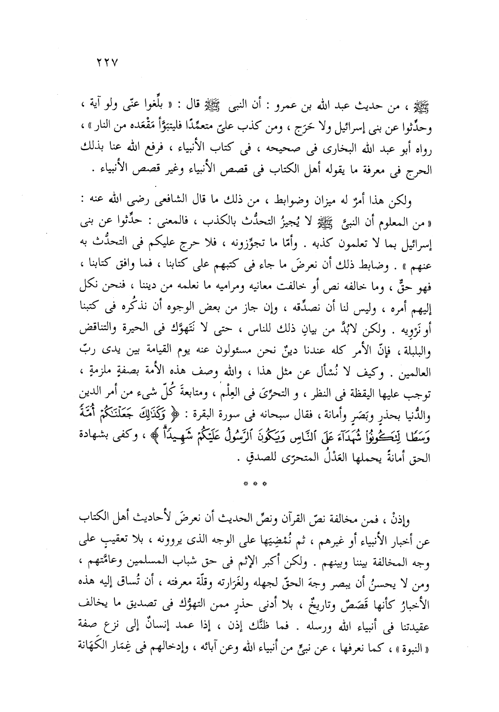 ولكن هذا أمر له ميزان وضوابط من ذلك ما قاله الشافعى رضى الله عنه: من المعلوم أن النبى صلى الله عليه وسلم لا يجيز التحدث بالكذب فالمعنى: حدثوا عن بنى إسرائيل بما لا تعلمون كذبه وأما ما تجوزونه فلا حرج عليكم في التحدث به عنهم. وضابط ذلك أن نعرض ما جاء في كتبهم عن كتابنا فما وافق كتابنا فهو حق وما خالف نص أو خالفت معانيه ومراميه ما نعلمه من ديننا فنحن نكل إليهم أمره وليس لنا أن نصدقه وإن جاز من بعض الوجوه أن نذكره في كتبنا أو نرويه. ولكن لابد من بيان ذلك للناس حتى لا نتهوك في الحيرة والتناقض والبلبة فإن الأمر كله عندنا دين نحن مسئولون عنه يوم القيامة بين يدي رب العالمين. وكيف لا نسأل عن مثل هذا والله وصف هذه الأمة بصفة ملزمة توجب عليها اليقظة في النظر والتحرى في العلم ومتابعة كل شيء في أمر الدين والدنيا بحذر وبصر وأمانة فقال سبحانه في سورة البقرة: ({وَكَذَلِكَ جَعَلْنَاكُمْ أُمَّةً وَسَطًا لِتَكُونُوا شُهَدَاءَ عَلَى النَّاسِ وَيَكُونَ الرَّسُولُ عَلَيْكُمْ شَهِيدًا} [البقرة: 143]). وكفى بشهادة الحق أمانة يحملها العدل المتحرى للصدق.