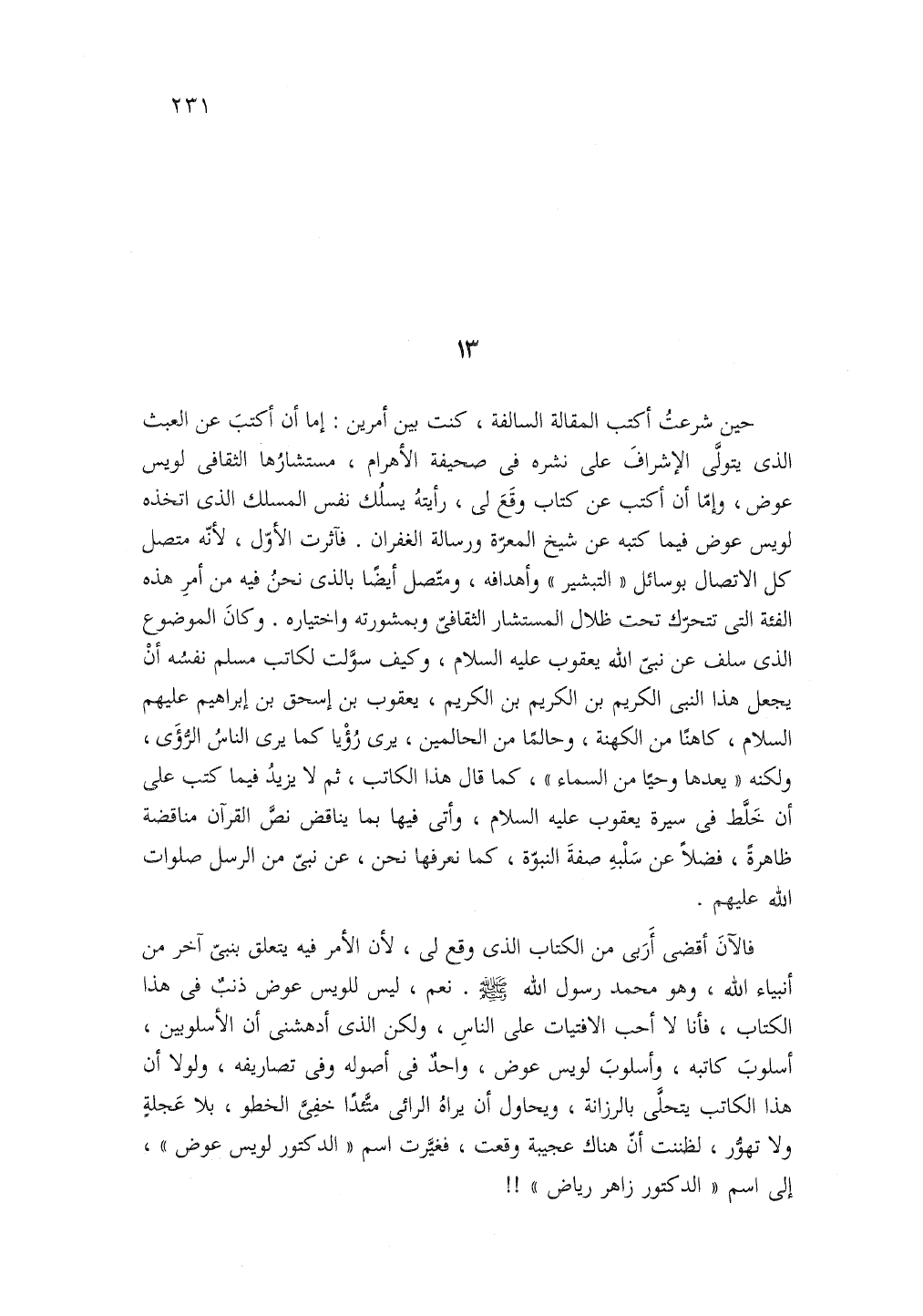 فالآن أقضى أَربي من الكتاب الذى وقع لى لأن الأمر فيه يتعلق بنى آخر من أنبياء الله وهو محمد صلى الله عليه وسلم نعم ليس للويس عوض ذنب في هذا الكتاب فأنا لا أحب الافتيات على الناس ولكن الذى ادهشنى أن الأسلوبين أسلوب كاتبه وأسلوب لويس عوض واحد في أصوله وفي تصاريفه ولولا أن هذا الكاتب يتحلى بالرزانة ويحاول أن يراه الرائى متئدا خفى الخطو بلا عجلة ولا تهور لظننت أن هناك عجيبة وقعت فغيرت اسم الدكتور لويس عوض إلى اسم الدكتور زاهر رياض!!