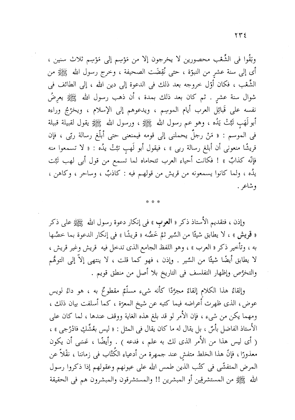وإذن فتقديم الإستاذ في ذكر العرب في إنكار دعوة رسول الله صلى الله عليه وسلم على ذكر قريش لا يطابق شيئا من السير ثم خصه قريشا في إنكار الدعوة بما خصها به وتأخير ذكر العرب وهو اللفظ الجامع الذى تدخل فيه قريش وغير قريش لا يطابق أيضا شيئا من السير. وإذن فهو كما قلت لا ينتهى إلا إلى التوهم والتخرص وإظهار التفلسف في التاريخ بلا أصل من منطق قويم.
