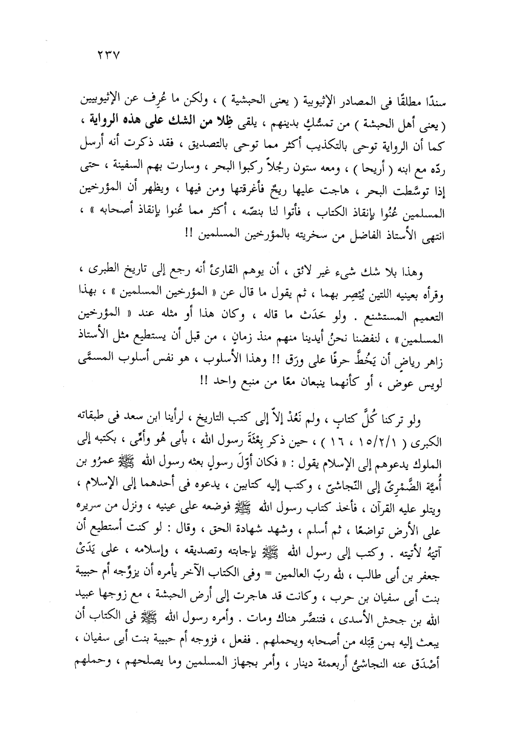 وهذا بلا شك غير لائق أن يوهم القارئ انه رجع إلى تاريخ الطبرى وقرأه بعينيه اللتين يبصر بهما ثم يقول ما قال عن المؤرخين المسلمين بهذا التعميم المستشنع ولو حدث ما قاله وكان هذا أو مثله عند المؤرخين المسلمين. لنفضنا نحن أيدينا منهم منذ زمان من قبل أن يستطيع مثل الأستاذ زاهر رياض أن يخط حرفا على الورق وهذا الأسلوب هو نفسه أسلوب المسمى لويس عوض أو كأنهما ينبعان معا من منبع واحد.