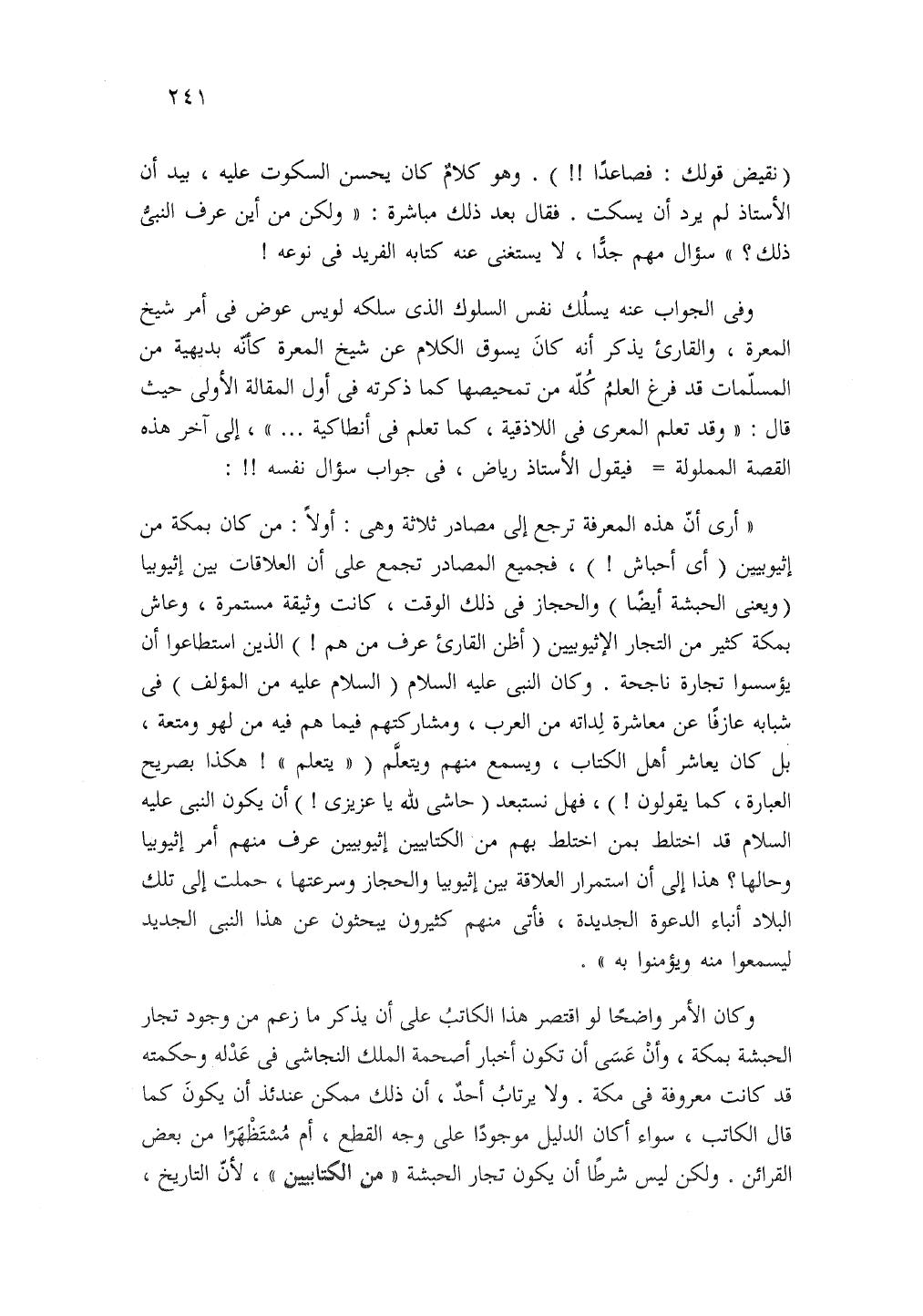 وكان الأمر واضحا لو اقتصر هذا الكاتب على أن يذكر ما زعم من وجود تجار الحبشة بمكة وأن عسى أن تكون أخبار أصحمة الملك النجاشى في عدله وحكمته قد كانت معروفة في مكة ولا يرتاب أحد أن ذلك ممكنا عندئذ أن يكون كما قال الكاتب سواء اكان الدليل موجودا على وجه القطع ام مستظهرا من بعض القرائن ولكن ليس شرطا أن يكون تجار الحبشة من الكتابيين لأن التاريخ