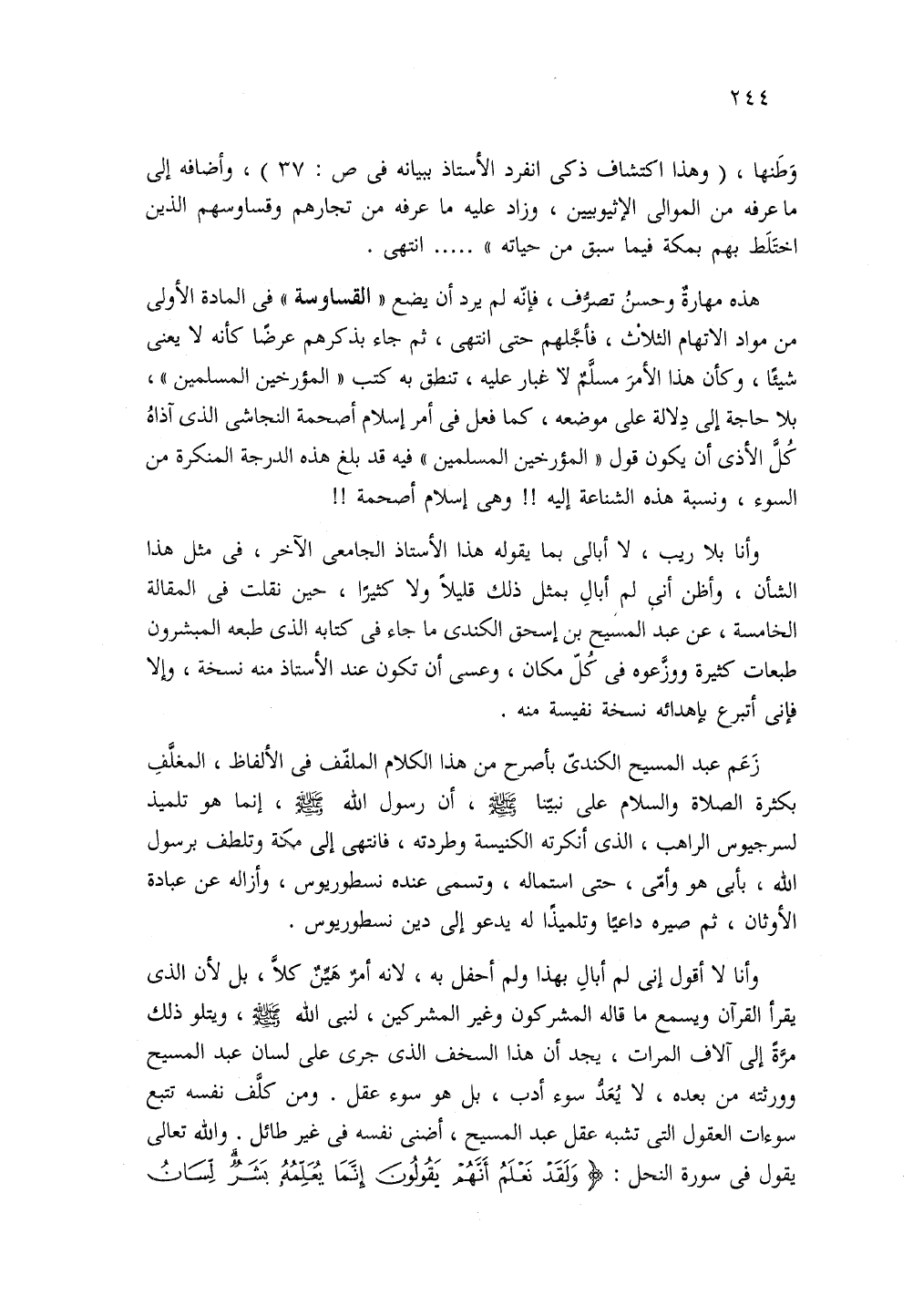 وأنا لا أقول إنى لم أبال بهذا ولم أحفل به لأنه أمر هين كلا بل لأن الذى يقرأ القرآن ويسمع ما قاله المشركون وغير المشركين لنبى الله صلى الله عليه وسلم ويتلو ذلك مرة إلى الآف المرات يجد أن هذا السخف الذى جرى على لسان عبد المسيح وورثته من بعده لا يعد سوء أدب بل هو سوء عقل ومن كلف نفسه تتبع سوءات العقول التي تسبه عقل عبد المسيح أضنى نفسه في غير طائل والله تعالى يقول في سورة النحل: {وَلَقَدْ نَعْلَمُ أَنَّهُمْ يَقُولُونَ إِنَّمَا يُعَلِّمُهُ بَشَرٌ لِسَانُ