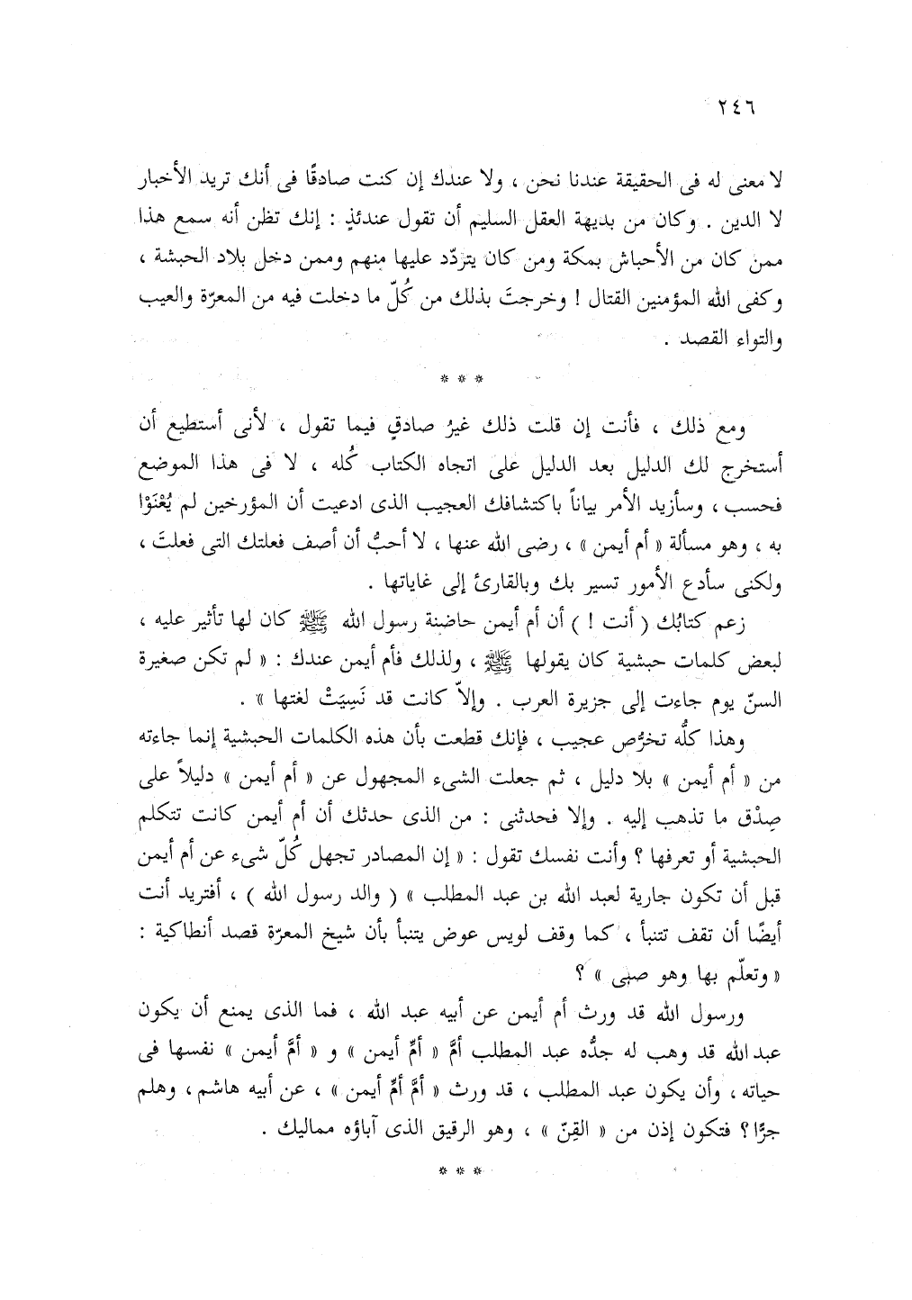 ومع ذلك فأنت إن قلت ذلك غير صادق فيما تقول لأنى استطيع ان استخرج لك الدليل بعد الدليل على اتجاه الكتاب كله لا في هذا الموضع فحسب وسأزيد الأمر بيانا باكتشافك العجيب الذى ادعيت أن المؤرخين لم يعنوا به وهو مسأله أم ايمن رضى الله عنها لا أحب أن اصف فعلتك التي فعلت ولكتى سأدع الأمور تسير بك وبالقارئ إلى غاياتها.