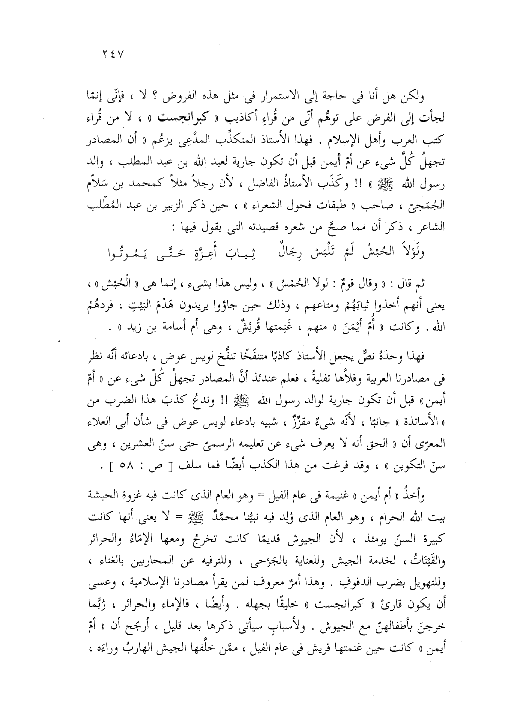 ولكن هل أنا في حاجة إلى الاستمرار في مثل هذه الفروض لا فإنى إنما لجأت إلى الفرض على توهم أنى من قراء أكاذيب كبرانجست لا من قراء كتب العرب وأهل الإسلام فهذا الأستاذ المتكدب المدعى يزعم أن المصادر تجهل كل شيء عن أم أيمن قبل أن تكون جارية لعبدالله بن عبد المطلب والد رسول الله صلى الله عليه وسلم وكذب الأستاذ الفاضل لأن رجلا مثلا كمحمد بن سلام الجمحى صاحب طبقات فحول الشعراء حين ذكر الزبير بن عبد المطلب الشاعر ذكر أن مما صح من شعره قصيدته التي يقول فيها: