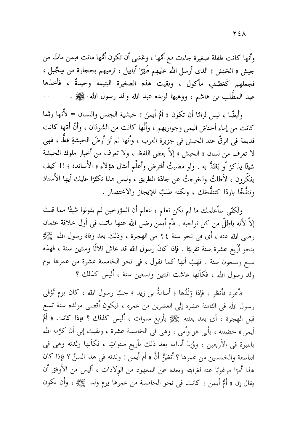 وأيضا ليس لزاما أن تكون أم ايمن حبشية الجنس واللسان لأنها ربما كانت من إماء أحباش اليمن وجواريهم وأنها كانت من السودان وأن أمها كانت قديمة في الرق عند الحبش في جزيرة العرب وأنها لم تر أرض الحبشة قط فهي لا تعرف من لسان الحبش إلا بعض اللفظ ولا تعرف من أخبار ملوك الحبشة شيئا يذكر أو يعتد به ولو مضيت أفترض وأعلم امثال هؤلاء الأساتذة كيف يفكرون لأطلت ولخرجت عن جادة الطريق وليس هذا تكبرا عليك ايها الأستاذ وتنفخا باردا كتنفخك ولكنه طلب للإيجاز والاختصار.