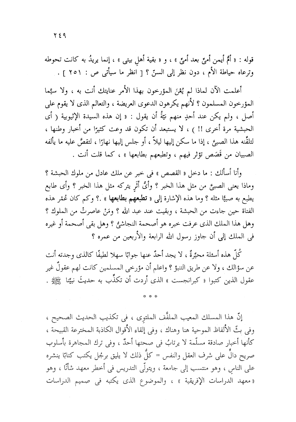 إن هذا المسلك المعيب الملفف الملتوى في تكذيب الحديث الصحيح وفي بث الألفاظ الموحيه هنا وهناك وفي إلقاء الأقوال الكاذبة المخترعة القبيحة كانها أخبار صادقة مسلمة لا يرتاب في صحتها أحد وفي ترك المجاهرة بأسلوب صريح دال على شرف العقل والنفس كل ذلك لا يليق برجل يكتب كتابا ينشره على الناس وهو منتسب إلى جامعة ويتولى التدريس في أخطر معهد شأنا وهو معهد الدراسات الإفريقية والموضوع الذى يكتبه في صميم الدراسات