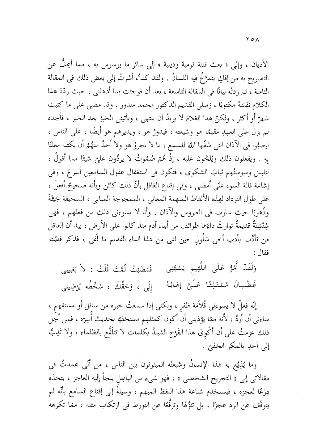الاديان والى بعث فتنه قوميه ودينيه إلى سائر ما يوسوس به مما اعف عن التصريح به من افك يتمرغ فيه اللسان ولقد كنت اشرت إلى بعض ذلك في المقالة الثامنه ثم زدته بيانا في المقالة التاسعة بعد ان فوجئت بما اذهلنى حيث ردد هذا الكلام نفسه مكتوبا زميلى القديم الدكتور محمد مندور وقد مضى على ما كتبت شهر أو اكثر ولكن هذا الغلام لا يريد ان ينتهى ويأتينى الخبر بعد الخبر فاجدة لم يزل على العهد مقيما هو وشيعته فيدور هو ويديرهم هو أيضًا على الناس ليصبوا في الاذان التي شقها الله للسمع ما لا يجرؤ هو ولا احد منهم ان يكتبه معلنا به ويفعلون ذلك ويلحون عليه اذ هم صموت لا يردون على شيئا مما اقول لتلبيس وسوستهم ثياب الشكوى فتكون في استغفال عقول السامعين اسرع وفي اشاعه قاله السوء عنى امضى وفي اقناع الغافل بان ذلك كائن وبأنه صحيح افعل على طول الترداد لهذه الألفاظ المبهمه المعانى الممجوجه المبانى السخيفة جيثه وذهوبا حيث سارت في الطروس والاذان وانا لا يسوءنى ذلك من فعلهم فهي شنشنه قديمه توارث داءها طوائف من ابناء ادم منذ كانوا على الأرض بيد ان العاقل من تأدب بأدب اخى سلول حين لقى من هذا الداء القديم ما لقى فذكر قصته فقال: