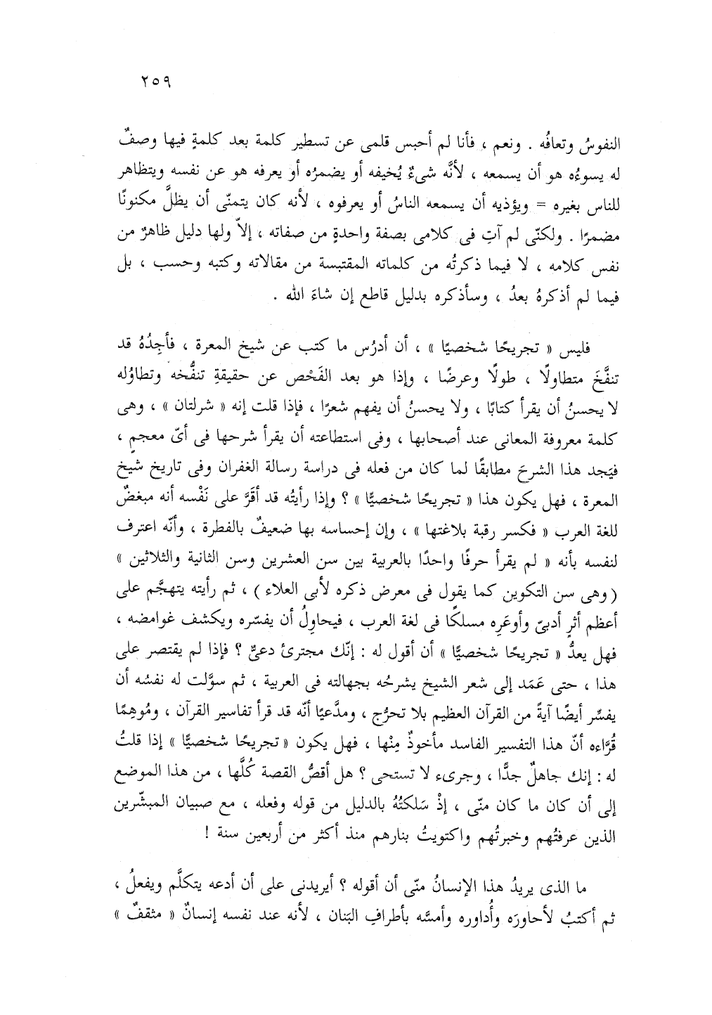 فليس تجريحا شخصيا ان ادرس ما كتب عن شيخ المعرة فتاجده قد تنفخ متطاولا طولا وعرضا واذا هو بعد الفحص عن حقيقه تنفخه وتطاوله لا يحسن ان يقرا كتابا ولا يحسن ان يفهم شعرا فإذا قلت انه شرلتان وهى كلمه معروفه المعانى عند أصحابها وفي استطاعته ان يقرا شرحها في اى معجم فيجد هذا الشرح مطابقا لما كان من فعله في دراسه رساله الغفران وفي تاريخ شيخ المعرة فهل يكون هذا تجريحا شخصيا واذا رأيته قد اقر على نفسه انه مبغض للغة العرب فكسر رقبه بلاغتها وان حاسه بها ضعيف بالفطرة وانه اعترف لنفسه بانه لم يقرا حرفا واحدا بالعربية بين سن العشرين وسن الثانية والثلاثين وهى سن التكوين كما يقول في معرض ذكرة لابى العلاء ثم رايته يتهجم على اعظم اثر ادبى واوعره مسلكا في لغة العرب فيحاول ان يفسره ويكشف غوامضه فهل يعد تجريحا شخصيا ان اقول له انك مجترئ دعى فاذا لم يقتصر على هذا حتى عمد إلى شعر الشيخ يشرحه بجهالته في العربية ثم سولت له نفسه ان يفسر أيضًا ايه من القرآن العظيم بلا تحرج ومدعيا انه قد قرأ تفاسير القرآن وموهما قراءه ان هذا التفسير الفاسد ماخوذ منها فهل يكون تجريحا شخصيا إذا قلت له انك جاهل جدا وجرئ لا تستحى هل أقص القصة كلها من هذا الموضع إلى أن كان ما كان منى إذ سلكته بالدليل ممن قوله وفعله مع صبيان المبشرين الذين عرفتهم وخبرتهم واكتويت بنارهم منذ أكثر من أربعين سنة!