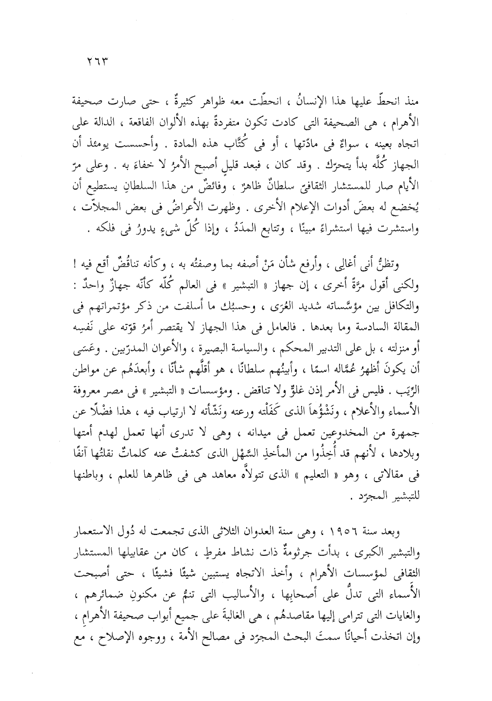 وبعد سنة 1965 وهى سنة العدوان الثلاثى الذى تجمعت له دول الاستعمار والتبشير الكبرى بدأت جرثومة ذات نشاط مفرط كان من عقابيلها المستشار الثقافي لمؤسسات الأهرام واخذ الاتجاه يستبين شيئا فشيئا حتى اصبحت الأسماء التي تدل على أصحابها والأساليب التي تنم عن مكنون ضمائرهم والغايات التي تترامى اليها مقاصدهم هي الغالبه على جميع ابواب صحيفة الأهرام وان اتخذت أحيانًا سمت البحث المجرد في مصالح الأمة ووجوه الاصلاح مع