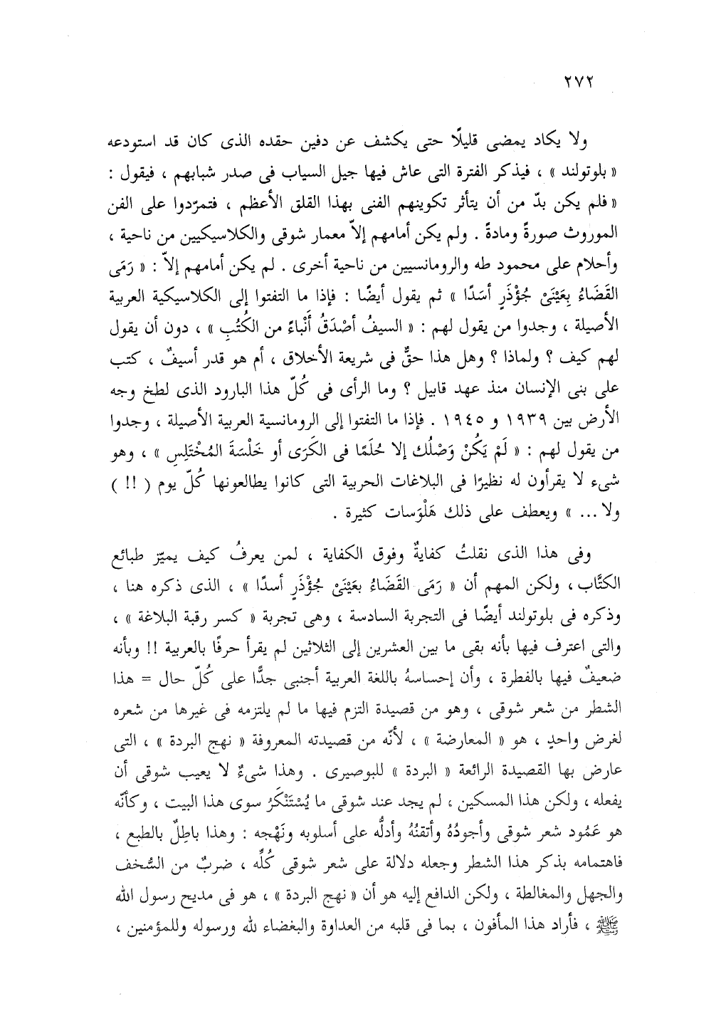 وفي هذا الذي نقلت كفاية وفوق الكفاية، لمن يعرف كيف يميز طبائع الكتَّاب، ولكن المهم أن "رَمَى القَضَاءُ بِعَيْنَىْ جُؤْذَرٍ أسَدًا" الذي ذكرناه هنا، وذكره "بلوتولند" أيضا في التجربة السادسة، وهي تجربة "كسر رقبة البلاغة"،والتي اعترف فيها بأنه بقى ما بين العشرين إلى الثلاثين لم يقرأ حرفا بالعربية!! وبأنه ضعيف فيها بالفطرة، وأن إحساسه باللغة العربية أجنبي جدا على كل حال = هذا الشطر من شعر شوقي، وهو من قصيدة التزم فيها ما لم يلتزمه في غيرها من شعره لغرض واحد، وهو "المعارضة"، لأنه من قصيدته المعروفة "نهج البردة"، التي عارض بها القصيدة الرائعة "البردة" للبوصيري. وهذا شئ لا يعيب شوقي أن يفعله، ولكن هذا المسكين، لم يجد عند شوقي ما يُستنكر سوى هذا البيت، وكأنه هو عمود شعر شوقي وأجودُهُ وأتقنُهُ وأدلُّه على أسلوبه ونهجه: وهذا بطال بالطبع، فاهتمامه بذكر هذا الشطر وجعله دلالة على شعر شوقي كله، ضرب من السخف والجهل والمغالطة، ولكن الدافع إليه هو أن "نهج البردة"،وهو في مديح رسول الله صلى الله عليه وسلم، فأراد هذا المأفون، بما في قلبه من العداوة والبغضاء لله ورسوله وللمؤمنين،
