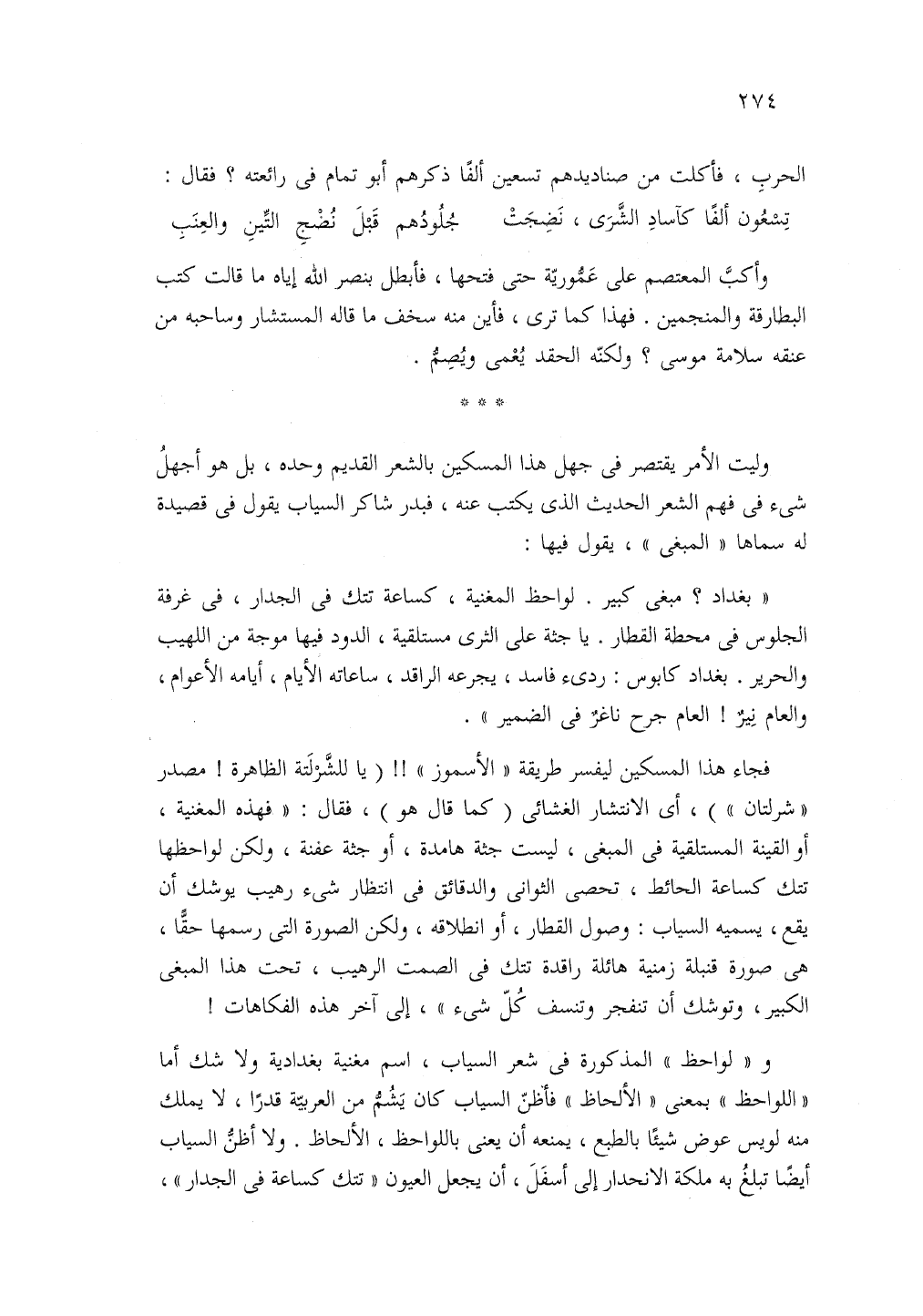 وأكبَّ المعتصم على عمورية حتى فتحها فأبطل بنصر الله اياه ما قالت كتب البطارقة والمنجمين فهذا كما ترى فأين منه سخف ما قاله المستشار وساحبه من عنقه سلامه موسى ولكنه الحقد يعمى ويصم.