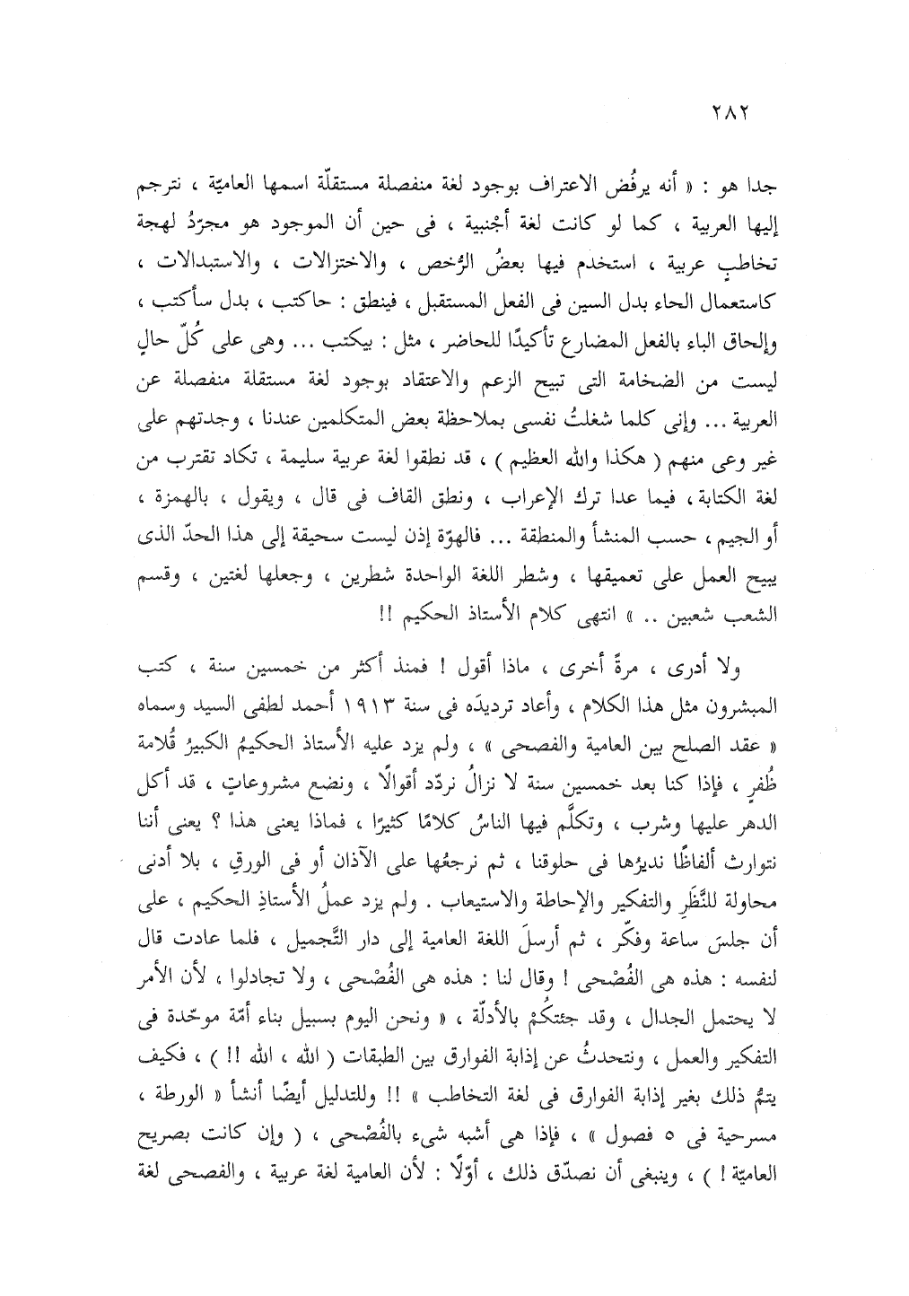 جدا هو أنه يرفض ألاعتراف بوجود لغة منفصله مستقله اسمها العامية نترجم إليها العر بية كما لو كانت لغة أجنبية في حين أن الموجود هو مجرد لهجة تخاطب عربية استخدم فيها بعض الرخص والاختزالات والاستبدالات كاستعمال الحاء بدل السين في الفعل المستقبل فينطق حاكتب بدل سأكتب والحاق الباء بالفعل المضارع تأكيدا للحأضر مثل بيكتب وهي على كل حالي ليست من الضخامة التي تبيح ألزعم والاعتقاد بوجود لغة مستقله منفصله عن العربية وإنى كلما شغلت نفسي بملاحظة بعض المتكلمين عندنا، وجدتهم على غير وعي منهم (هكذا والله العظيم) قد نطقوا لغة عربية سليمة تكاد تقترب من لغة الكتابة فيما عدا ترك الإعراب ونطق القاف في قال ويقول بالهمزة أو الجيم حسب المنشأ والمنطقه فالهوة إذن ليست سحيقه إلى هذا الحدالذى يبيح العمل على تعميقها وشطر اللغة الواحدة شطرين وجعلها لغتين وقسم الشعب شعبين انتهي كلام الأستاذ الحكيم!!