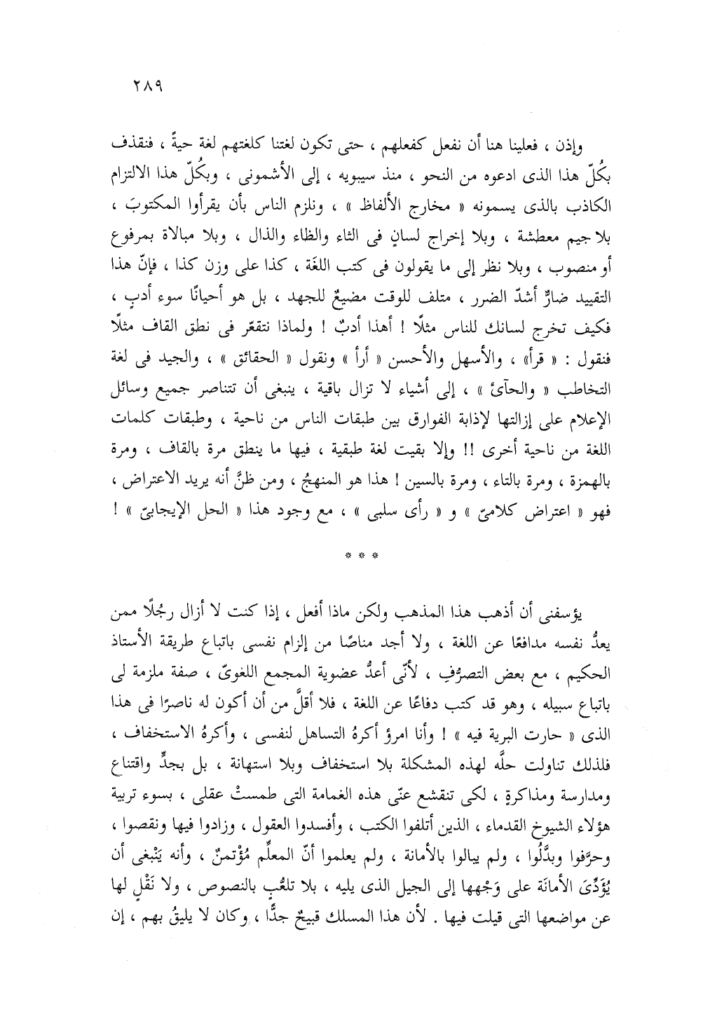 يؤسفنى ان اذهب هذا المذهب ولكن ماذا افعل إذا كنت لا ازال رجلا ممن يعد نفسه مدافعا عن اللغة ولا أجد مناصا من الزام نفسى باتباع طريقه الأستاذ الحكيم مع بعض التصرف لانى اعد عضويه المجمع اللغوى صفه ملزمه لى باتباع سبيله وهو قد كتب دفاعا عن اللغة فلا اقل من ان اكون له ناصرا في هذا الذى حارت البريه فيه وانا امرؤ اكره التساهل لنفسى واكره الاستخفاف فلذلك تناولت حله لهذه المشكلة بلا استخفاف وبلا استهانه بل بجد واقتناع ومدارسه ومذاكرة لكى تنقشع عنى هذه الغمامه التي طمست عقلي بسوء تربيه هؤلاء الشيوخ القدماء الذين اتلفوا الكتب وافسدوا العقول وزادوا فيها ونقصوا وحرفوا وبدلوا ولم يبالو بالأمانة ولم يعلمو ا ان المعلم مؤتمن وانه ينبغى ان يؤدى الأمانة على وجهها إلى الجيل الذى يليه بلا تلعب بالنصوص ولا نقل لها عن مواضعها التي قيلت فيها لان هذا المسلك قبيح جدا وكان لا يليق بهم، إن