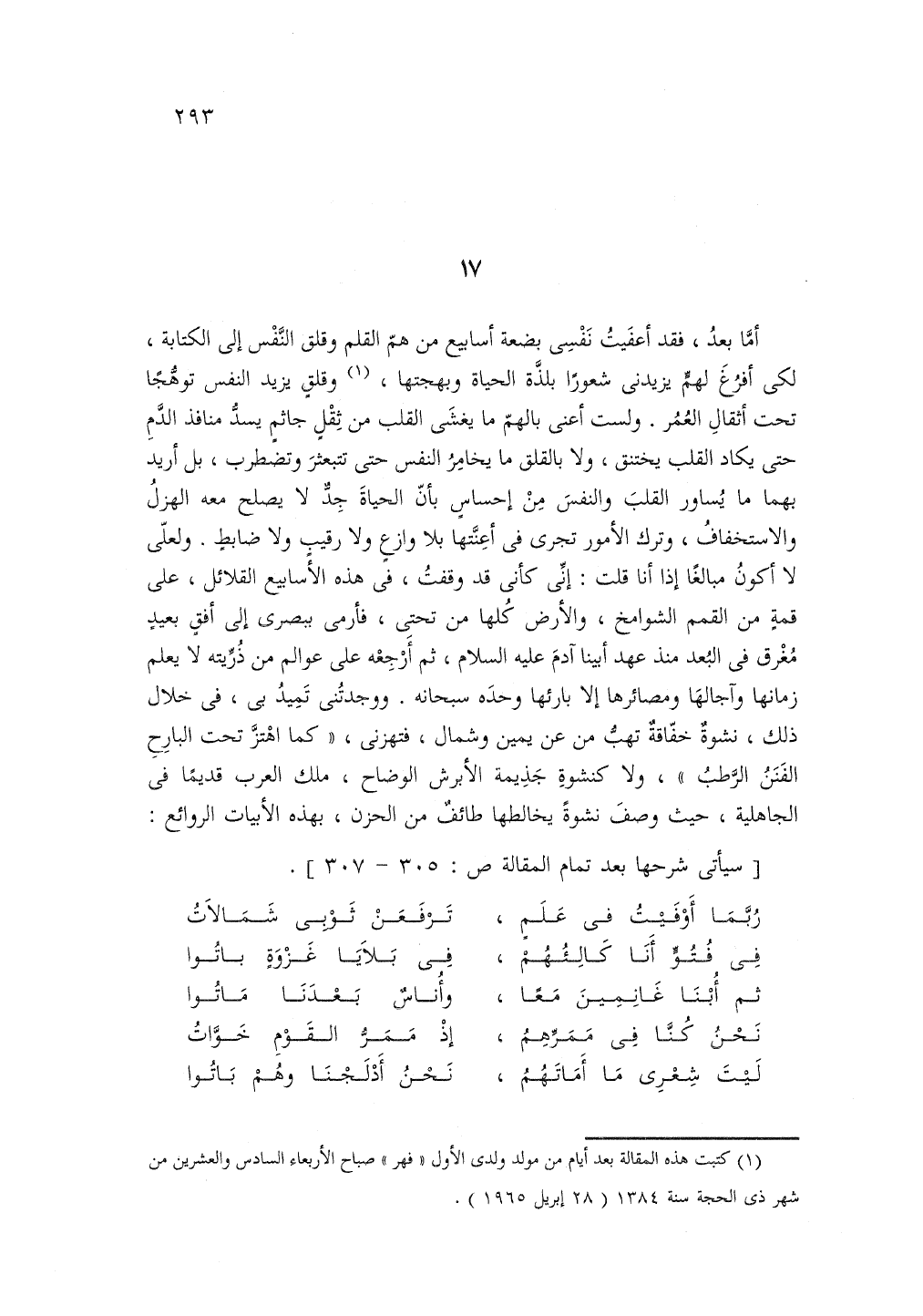 أما بعد فقد أعفيت نفسى بضعة أسابيع من هم القلم وقلق النفس إلى الكتابة لكى افرغ لهم يزيدنى شعورا بلذة الحياة وبهجتها، (1) وقلق يزيد النفس توهجا تحت اثقال العمر ولست اعنى بالهم ما يغشى القلب من ثقل جائم يسد منافذ الدم حتى يكاد القلب يختنق ولا بالقلق ما يخامر النفس حتى تتبعثر وتضطرب بل أريد بهما ما يساور القلب والنفس من احساس بان الحياة جد لا يصلح معه الهزل والاستخفاف وترك الامور تجرى في اعنتها بلا وازع ولا رقيب ولا ضابط ولعلى لا اكون مبالغا إذا انا قلت انى كانى قد وقفت في هذه الاسابيع القلائل على قمه من القمم الشوامخ والارض كلها من تحتى فارمى ببصرى إلى افق بعيد مغرق في البعد منذ عهد ابينا ادم عليه السلام ثم ارجعه على عوالم من ذريته لا يعلم زمانها واجالها ومصائرها الا بارئها وحدة سبحانه ووجدتنى تميد بى في خلال ذلك نشوة خفاقه تهب من عن يمين وشمال فتهزنى كما اهتز تحت البارح الفنن الرطب ولا كنشوة جذيمة الابرش الوضاح ملك العرب قديمًا في الجاهليه حيث وصف نشوة يخالطها طائف من الحزن بهذه الابيات الروائع: