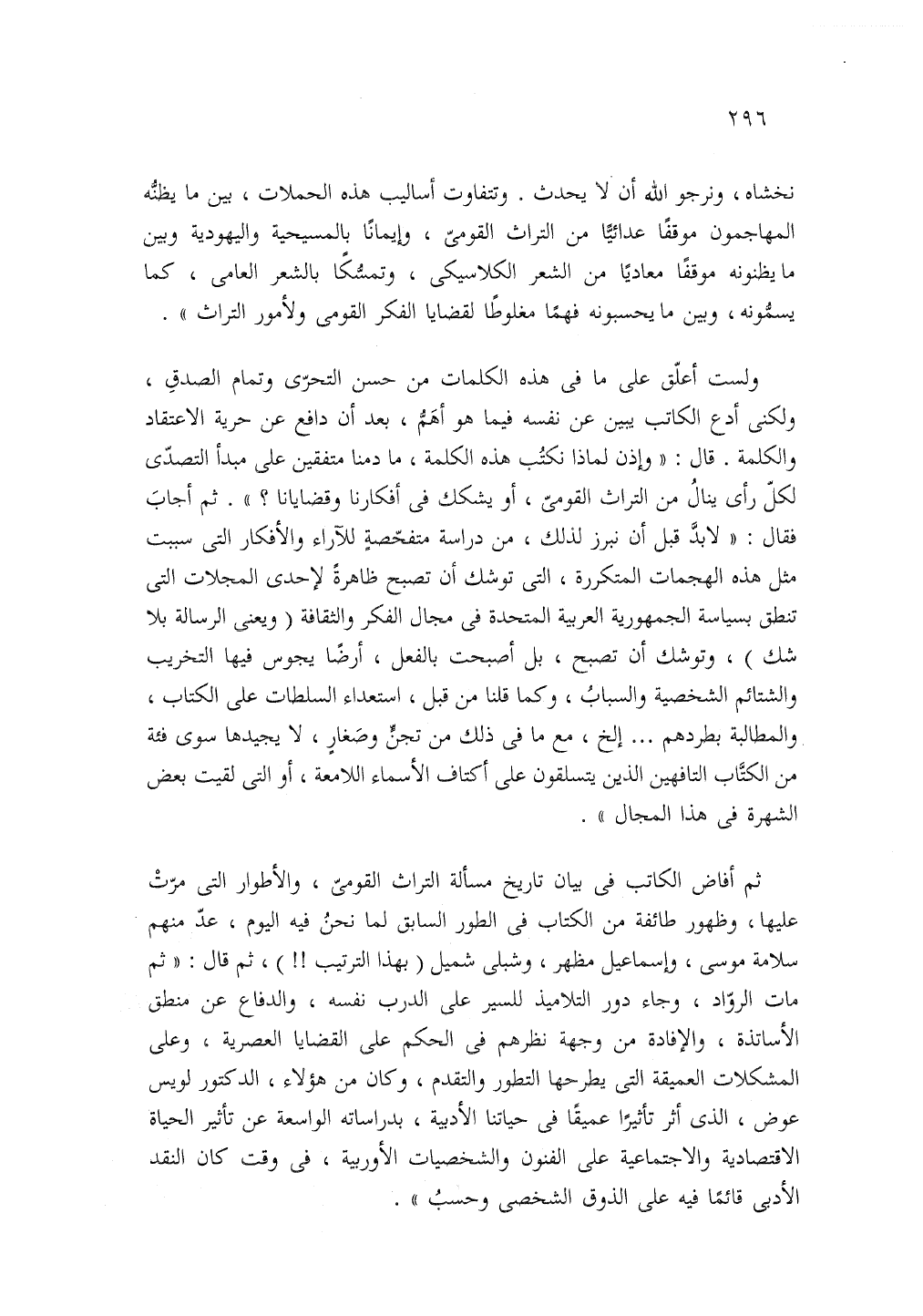 ولست أعلق على ما في هذه الكلمات من حسن التحرى وتمام الصدق ولكنى ادع الكتاب يبين عن نفسه فيما هو اهم بعد ان دافع عن حريه الاعتقاد والكلمه قال واذن لماذا نكنب هذه الكلمة ما دمنا متفقين على مبدأ التصدى لكل راى ينال من التراث القومى أو يشكك في افكارنا وقضايانا ثم أجاب فقال لابد قبل ان نبرز لذلك من دراسه متفحصه للاراء والافكار التي سبببت مثل هذه الهجمات المتكررة التي توشك ان تصبح ظاهرة لاحدى المجلات التي تنطق بسياسة الجمهورية العربية المتحدة في مجال الفكر والثقافة ويعنى الرسالة بلا شك وتوشك ان تصبح بل اصبحت بالفعل ارضا يجوس فيها التخريب والشتائم الشخصيه والسباب وكما قلنا من قبل استعداء السلطات على الكتاب والمطالبه بطردهم الخ مع ما في ذلك من تجن وصغار لا يجيدها سوى فئه من الكتاب التافهين الذين يتسلقون على اكتاف الأسماء اللامعة أو التي لقيت بعض الشهرة في هذا المجال.