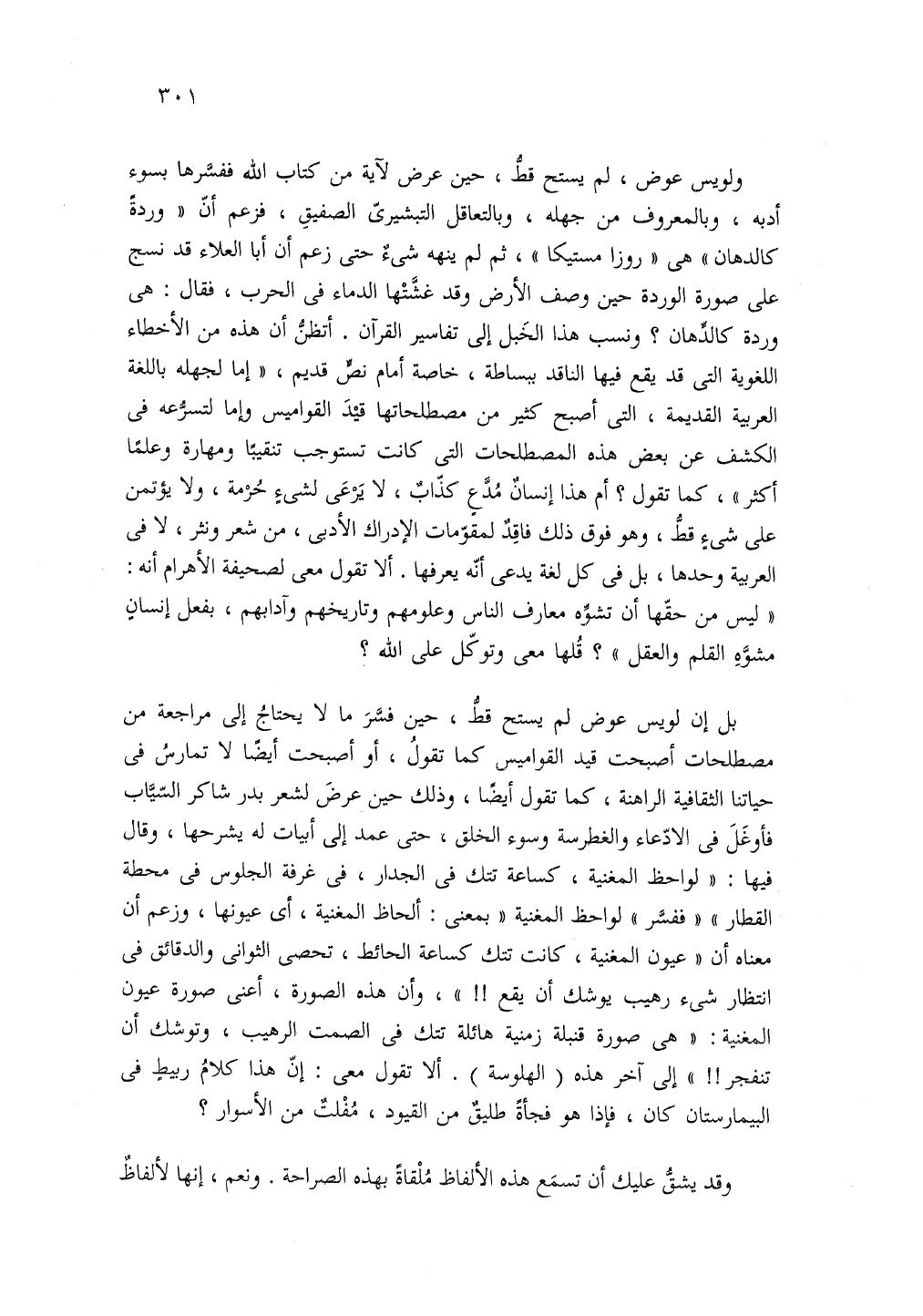 ولويس عوض، لم يستح قط حين عرض لايه من كتاب الله ففسرها بسوء ادبه وبالمعروف من جهله وبالتعاقل التبشيرى الصفيق فزعم ان وردة كالدهان هي روزا مستيكا ثم لم ينهه شئ حتى زعم ان ابا العلاء قد نسج على صورة الوردة حين وصف الأرض وقد غشتها الدماء في الحرب فقال هي وردة كالدهان ونسب هذا الخبل إلى تفاسير القرآن اتظن ان هذا من الأخطاء اللغوية التي قد يقع فيها الناقد ببساطه خاصه امام نص قديم اما لجهله باللغة العربية القديمه التي اصبح كثير من مصطلحاتها قيد القواميس واما لتسرعه في الكشف عن بعض هذه المصطلحات التي كانت تستوجب تنقيبا ومهارة وعلما اكثر كما تقول ام هذا انسان مدع كذاب لا يرعى لشئ حرمه ولا يؤتمن على شئ قط وهو فوق ذلك فاقد لمقومات الادراك الادبى من شعر ونثر لا في العربية وحدها بل في كل لغة يدعى انه يعرفها الا تقول معى لصحيفة الأهرام انه ليس من حقها ان تشوة معارف الناس وعلومهم وتاريخهم وادابهم بفعل انسان مشوه القلم والعقل قلها معى توكل على الله؟