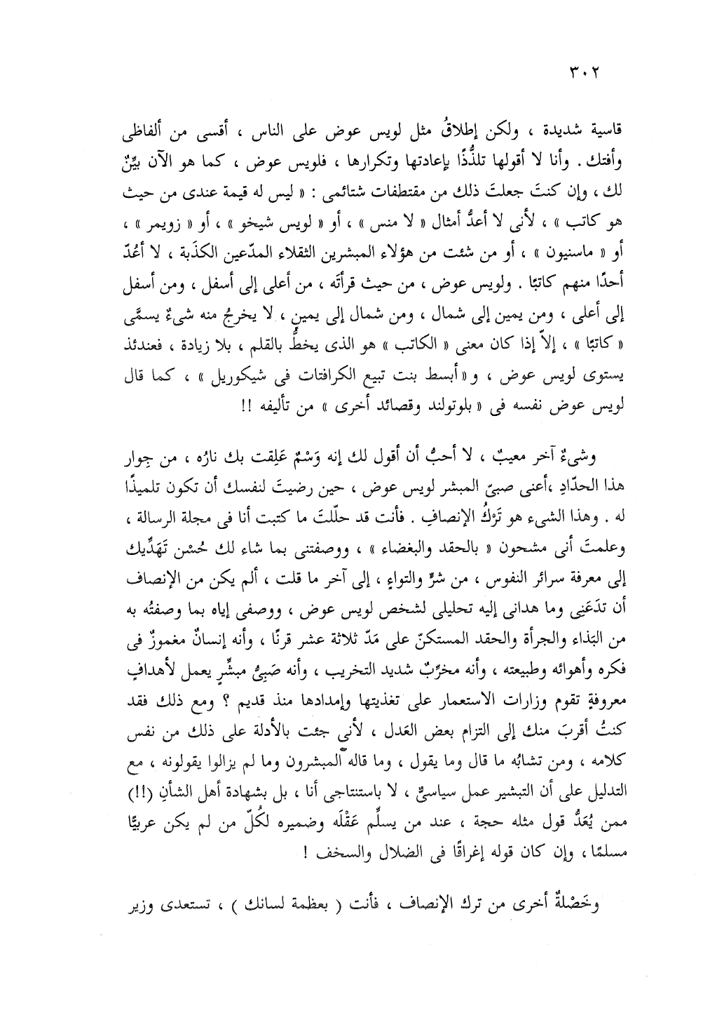 وشئ اخر معيب لا أحب ان اقول لك انه وسم علقت بك ناره من جوار هذا الحداد اعنى صبى المبشر لويس عوض حين رضيت لنفسك ان تكون تلميذا له وهذا الشئ هو ترك الانصاف فانت قد حللت ما كتبت انا في مجله الرسالة وعلمت انى مشحون بالحقد والبغضاء ووصفتنى بما شاء لك حسن تهديك إلى معرفه سرائر النفوس من شر والتواء إلى اخر ما قلت الم يكن من الانصاف ان تدعنى وما هدانى اليه تحليلى لشخص لويس عوض ووصفى اياه بما وصفته به من البذاء والجراءه والحقد المستكن على مد ثلاثه عشر قرنا وانه انسان مغمور في فكرة واهوائه وطبيعته وانه مخرب شديد التخريب وانه صبى مبشر يعمل لاهداف معروفه تقوم وزارات الاستعمار على تغذيتها وامدادها منذ قديم ومع ذلك فقد كنت اقرب منك إلى التزام بعض العدل لانى جئت بالادله على ذلك من نفس كلامه ومن تشابه ما قال وما يقول وما قاله المبشرون وما لم يزالوا يقولونه مع التدليل على ان التبشير عمل سياسى لا باستنتاجى انا بل بشهادة أهل الشان ممن يعد قول مثله حجه عند من يسلم عقل وضميرة لكل من لم يكن عربية مسلما وان كان قوله اغراقا في الضلال والسخف!
