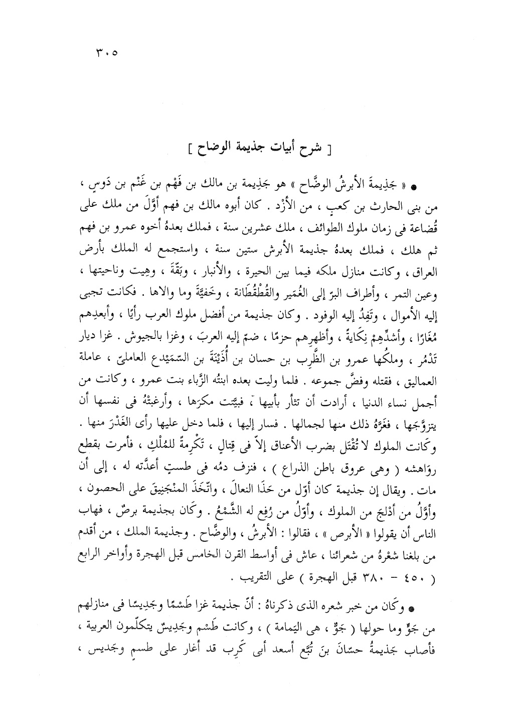 "جَذِيمةَ الأبرشُ الوضَّاح" هو جَذِيمة بن مالك بن فهم بن غنم بن دوس، من بنى الحارث بن كعب، من الأزْد. كان أبوه مالك بن فهم أول من ملك علة قضاعه في زمان ملوك الطوائف، ملك عشرين سنة فملك بعده اخوه عمرو بن فهم ثم هلك فملك بعده جذيمة الابرش ستين سنة واستجمع له الملك بارض العراق وكانت منازل ملكه فيما بين الحيرة والانبار وبقه وهيت وناحيتها وعين التمر واطراف البر إلى الغمير والقطقطانه وخفيه وما والاها فكانت تجبى اليه الأموال وتفد اليه الوفود وكان جذيمة من افضل ملوك العرب رايا وابعدهم مغارا واشدهم نكايه واظهرهم حزما ضم اليه العرب وغزا بالجيوش غزا ديار تدمر وملكها عمرو بن الظرب بن حسان بن اذينه بن السميدع العاملى عامله العماليق فقتله وفض جموعه فلما وليت بعده ابنته الزباء بنت عمرو وكانت من اجمل نساء الدنيا ارادت ان تثأر بأبيها فبيتت مكرها وارغبته عن نفسها ان يتزوجها فغرة ذلك منها لجمالها فسار اليها فلما دخل عليها راى الغدر منها وكانت الملوك لا تقتل بضرب الاعناق الا في قتال تكرمه للملك فأمرت بقطع رواهشه وهى عروق باطن الذراع فنزف دمه في طست اعدته له إلى ان مات ويقال ان جذيمة كان أول من حذا النعال واتخذ المنجنيق على الحصون وأول من ادلج من الملوك وأول من رفع له الشمع وكان وجذيمه الملك من اقدم من بلغنا شعره من شعرائنا عاش في اواسط القرن الخامس قبل الهجرة وأواخر الرابع (450 - 380 قبل الهجرة) على التقريب.