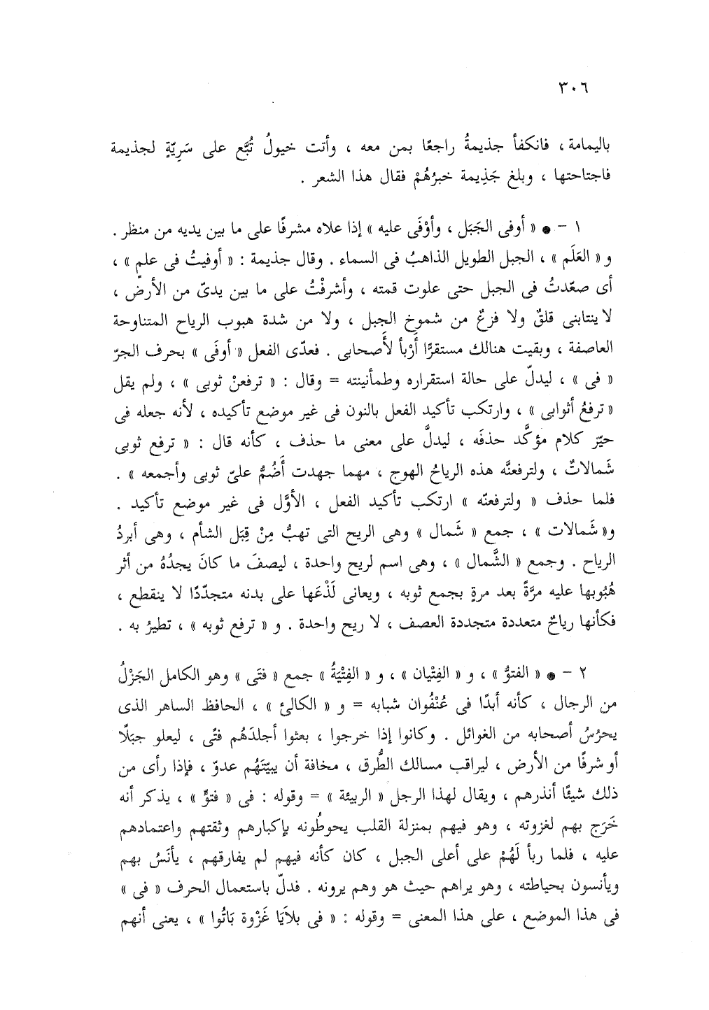 1 - "أوفى الجبل، وأوفى عليه" إذا علاه مشرفا على ما بين يديه من منظر والعلم الجبل الطويل الذاهب في المساء وقال جذيمة اوفيت في علم اى صعدت في الجبل حتى علوت قمته واشرفت على ما بين يدى من الأرض لا ينتابنى قلق ولا فزع من شموخ الجبل ولا من شده هبوب الرياح المتناوحه العاصفه وبقيت هنالك مستقرا اربا لاصحابى فعدى الفعل اوفى بحرف الجر في ليدل على حاله استقراره وطمأنينته وقال ترفعن ثوبى ولم يقل ترفع اثوابى وارتكب تاكيد الفعل بالنون في غير موضع تاكيدة لأنه جعله في حير كلام مؤكد حذفه ليدل على معنى بالنون في غير موضع تاكيدة لأنه جعله في حير كلام مؤكدا حذفه ليدل على معنى ما حذف كانه قال ترفع ثوبى شمالات ولترفعنه ارتكب تأكيد الفعل الأول في غير موضع تاكيد وشمالات جمع شمال وهى الريح التي تهب من قبل الشام وهى ابرد الرياح زجمع الشمال وهى اسم ليريح واحدة ليصف ما كان يجدة من اثر هبوبها عليه بعد مرة بجمع ثوبه ويعانى لذعها على بدنه متجددا لا ينقطع فكأنها رياح متعددة متجددة العصف لا ريح واحدة وترفع ثوبه تطير به.