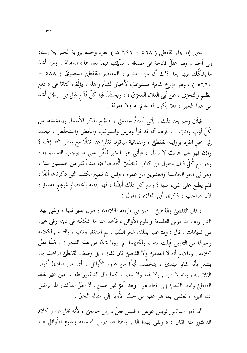"قال القفطى والذهبى فمر في طريقه بالاذقية فنزل بدير فيها ولقى بهذا الدير راهبا قد درس الفلسفة وعلوم الأوائل فأخذ عنه ما شككه في دينه وفي غيره من الديانات قال ونم عليه بذلك شعر الصبا ثم استغفر وتاب والتمس لكلامه وجوها من التأويل قبلت منه ولكنهما لم يرويا شيئا من هذا الشعر". هذا نص كلامه، وواضح أنه لا القفطى ولا الذهبى قال ذلك، بل وصف القفطى الراهب بما يشعر بأنه شاد مبتدى يتخطف نبذا من علوم الأوائل أي من مبادئ أقوال الفلاسفة وأنه لا درس ولا فقه ولا علم كما قال الدكتور طه حين غير لفظ القفطى ولفظ الذهبى إلى لفظ هو وهذا أمر غير حسن لا أظن الدكتور طه يرضى عنه اليوم لعلمى بما هو عليه من حبِّ الأَوْبة إلى مقالة الحقّ.