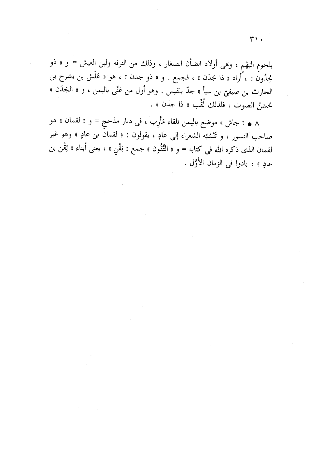 8 - "جاش" موضع باليمن تلقاء مأرب في ديار مذحج ولقممان هو صاحب النسور وتنسبه الشعراء إلى عاد يقولون لقمان بن ععاد وهو غير لقمان الذى ذكرة الله في كتابه والتقون جمع تقن يعنى ابناء تقن بن عاد بادوا في الزمان الأول.