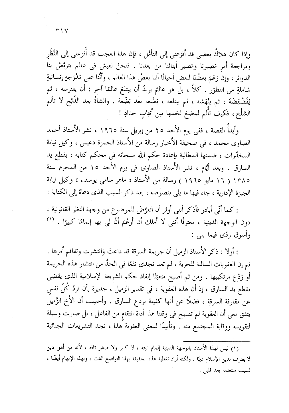 وابدا القصة ففى يوم الاحد 25 من ابريل سنه 1965 نشر الأستاذ أحمد الصاوى محمد في صحيفة الأخبار رسالة من الأستاذ الحمزة دعبس وكيل نيابه الخدرات ضمنها المطالبه باعادة حكم الله في محكم كتابه بقطع يد السارق وبعد ايام نشر الأستاذ الصاوى في يوم الحد 15 من المحرم سنة 1385 16 مايو 1965 رساله من الأستاذ ماهر سامى يوسف وكيل نيابه الجيزه الاداريه جاء فيها ما يلى بنصوصه بعد ذكر السبب الذى دعاه إلى الكتابة: