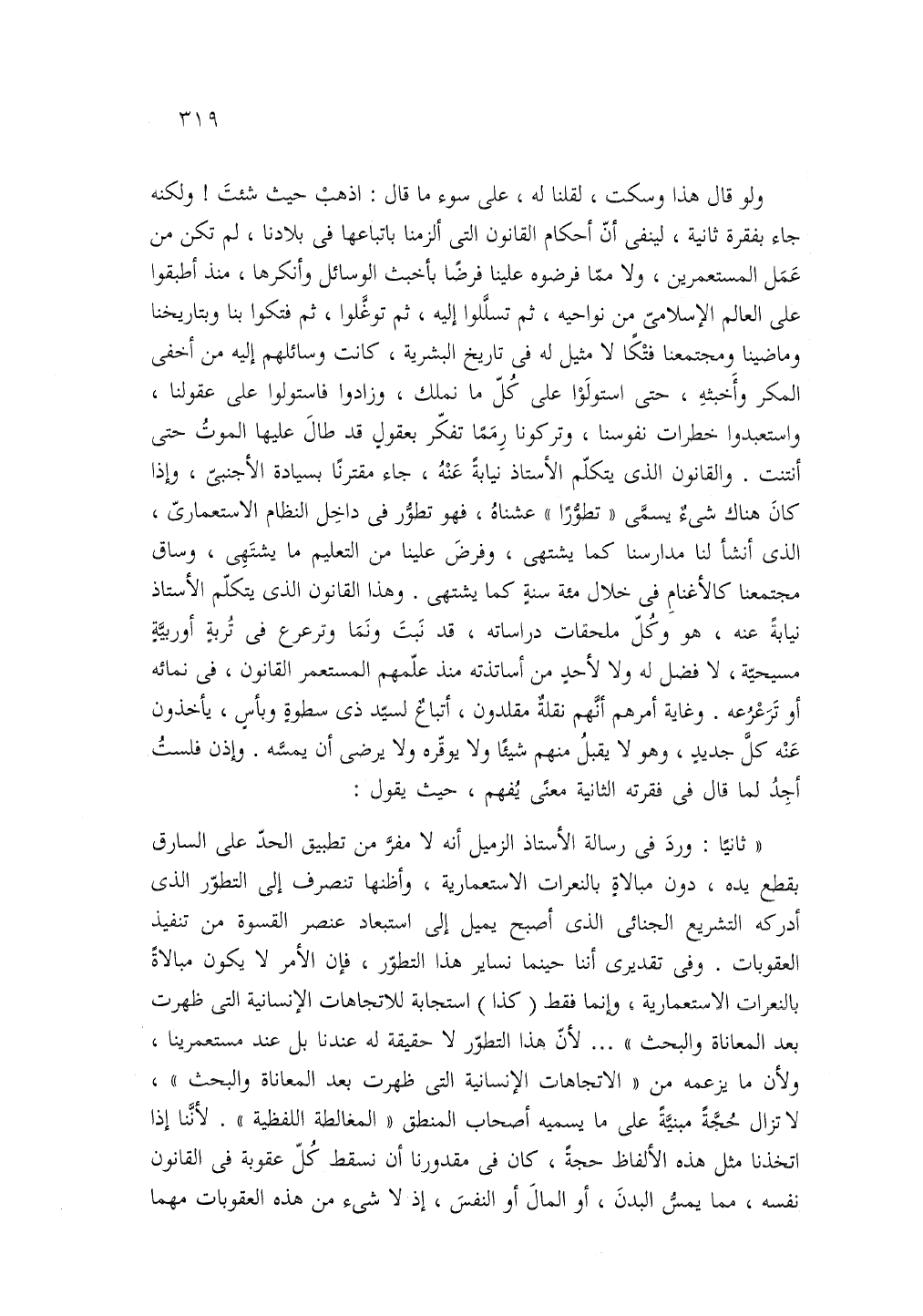ثانيا: ورد في رساله الأستاذ الزميل انه لا مفرَّ من تطبيق الحد على السارق بقطع يده، دون مبالاة بالنعرات الاستعمارية واظنها تنصرف إلى التطور الذى ادركه التشريع الجنائى الذى اصبح يميل إلى استعباد عنصر القسوة من تنفيذ العقوبات وفي تقديرى اننا حينما نساير إلى استعباد عنصر القسوة من تنفيذ العقوبات وفي تقديرى اننا حينما نساير هذا التطور فان الامر لا يكون مبالاة بالنعرات الاستعمارية وانما فقط كذا استجابه للاتجاهات الإنسانية التي ظهرت بعد المعاناه والبحث لان هذا التطور لا حقيقه له عندنا بل عند مستعمرينا ولان ما يزعمه من الاتجاهات الإنسانية التي ظهرت بعد المعاناه والبحث لاتزال حجه مبنيه على ما يسميه أصحاب المنطق المغالطه اللفظيه لاننا إذا اتخذنا مثل هذه الألفاظ حجه كان في مقدورنا ان نسقط كل عقوبه في القانون نفسه مما يمس البدن أو المال أو النفس، اذ لا شئ من هذه العقوبات مهما