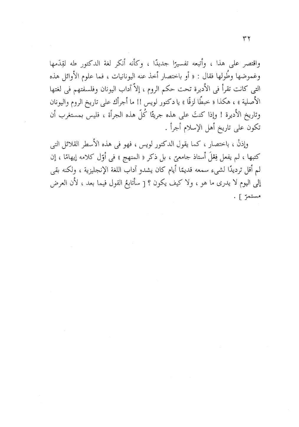 واقتصر على هذا واتبعه تفسيرا جديدا وكانه انكر لغة الدكتور طه لقدمها وغموضها وطولها فقال أو باختصار أخذ عنه اليونانيات فما علوم الأوائل هذه التي كانت تقرأ في الأديرة تحت حكم الروم الا آداب اليونان وفلسفتهم في لغتها الأصلية هكذا خبطا لزقا يا دكتور لويس ما أجرأك على تاريخ الروم واليونان وتاريخ الأديرة واذا كنت على هذه جريئا كل هذه الجرأة فليس بمستغرب أن تكون على تاريخ أهل الإسلام أجرأ.