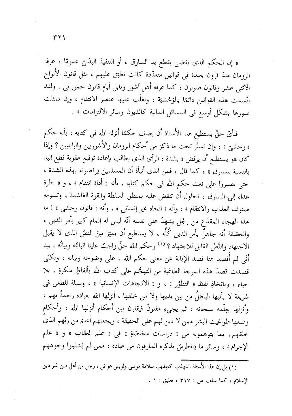 فباى حق يستطيع هذا الأستاذ ان يصف حكما انزله الله في كتابه بانه حكم وحشى وان تستر تحت ما ذكر من احكام الرومان والاشوريين والبابليين واذا كان هو يستطيع ان يرفض بشدة الراى الذى يطالب باعادة توقيع عقوبه قطع اليد بالنسبه للسارق كما قال فمن الذى انباه المسلمين يرفضونه بهذه الشده حتى يصبروا على نعت حكم الله في حكم كتابه بانه أداة انتقام ونظرة عداء إلى السارق تحأول ان تنقض عليه بمنطق السلطة والقوه الغاشمة وتسومه صنوف العذاب والانتقام وانه انتجاه غير انسانى وانه قانون وحشى ما هذا الهجاء المقذع من رجل يشهد على نفسه انه ليس له المام كبير بامر الدين والحقيقه انه جاهل بامر الدين كله لا يستطيع ان يمير بين النص الذى لا يقبل الاجتهاد والنص القابل لاجتهاد وحكم الله حق واجب علينا بين النص الذى لا يقبل الاجتهاد والنص القابل للاجتهاد؟ (1) وحكم الله حق واجب علينا اتباعه وبيانه بيد انى لم اقصد هنا قصد الابانه عن معنى حكم الله على وضوحه وبيانه ولكنى قصدت قصد هذه الموجه الطاغيه من التهجم على كتاب الله بالفاظ منكرة بلا حياء وباتخاذ لفظ التطور والاتجاهات الإنسانية وسيله للطعن في شريعه لا ياتيها الباطل من بين يديها ولا من خلفها انزلها الله لعبادة رحمه بهم وانزلها بعلمه سبحانه ثم يجئ مفتون فيقارن بين احكام انزلها الله واحكام وضعها طواغيت البشر ممن لا دين لهم على الحقيقه ويجعلهم اعلم من ربهم الذى خلقهم بما يتوهمونه من دراسات مخلصه في علم العقاب وعلم الاجرام وسائر ما يتغطرس بذكرة المارقون من عبادة، ممن لم يسلموا وجوههم