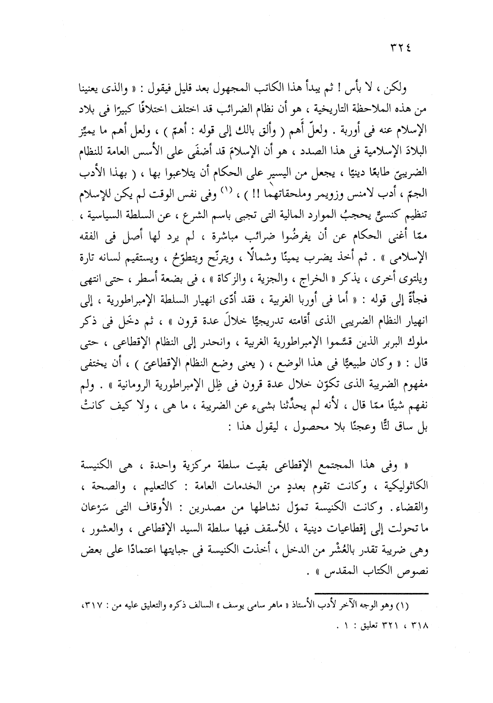 ولكن لا باس ثم يبدأ هذا الكاتب المجهول بعد قليل فيقول والذى يعنينا من هذه الملاحظه التاريخيه هو ان نظام الضرائب قد اختلف اختلافا كبيرا في بلاد الإسلام عنه في أوربة ولعل اهم والق بالك إلى قوله اهم ولعل اهم ما يميز البلاد الإسلامية في هذا الصدد هو ان الإسلام قد أضفى على الأسس العامة للنظام الضريبي طابعا دينيا يجعل من اليسير على الحكام ان يتلاعبوا بها بهذا الأدب الجم أدب لامنس وزويمر وملحقاتهما!!)، (1) وفي نفس الوقت لم يكن للاسلام تنظيم كنسي يحجب الموارد المالية التي تجبى باسم الشرع عن السلطة السياسية مما اغنى الحكام عن ان يفرضوا ضرائب مباشره لم يرد لها اصل في الفقه الإسلامي ثم اخذ يضرب يمينا وشمالا ويترنح ويتطوح ويستقيم لسانه تارة ويلتوى أخرى يذكر "الخراج والجزية والزكاة" في بضعة أسطر حتى انتهى فجأة إلى قوله: "أما في أوربا الغربية فقد ادى انهيار السلطة الإمبراطورية إلى انهيار النظام الضريبي الذى اقامته تدريجيا خلال عدة قرون"، ثم دخل في ذكر ملوك البربر الذين قسموا الإمبراطورية الغربية وانحدر إلى النظام الإقطاعي حتى قال وكان طبيعيا في هذا الوضع يعنى وضع النظام الإقطاعي ان يختفى مفهوم الضريبة الذى تكون خلال عدة قرون في ظل الإمبراطورية الرومانية ولم نفهم شيئا مما قال لأنه لم يحدثنا بشئ عن الضريبة ما هي ولا كيف كانت بل ساق لتَّا وعجنّا بلا حصول، ليقول هذا: