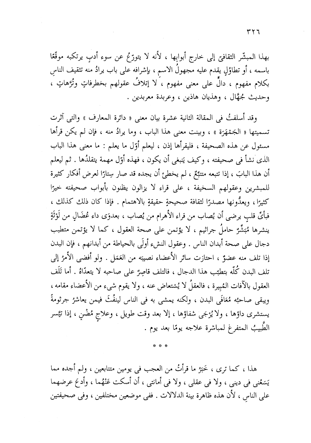 وقد أسلفت في المقالة الثانية عشرة بيان معنى دائرة المعارف والتى اثرت تسميتها الجمهرة وبينت معنى هذا الباب وما يراد منه فان لم يكن قرأها مسؤل عن هذه الصحيفة وكيف ينبغى ان يكون فهذه أول مهمة يتقلدها ثم ليعلم ان هذا الباب إذا تتبعه متتبع لم يخطئ ان يجده قد صار ستارا لعرض أفكار كثيرة للمبشرين وعقولهم السخيفة على قراء لا يزالون يظنون بابواب صحيفته خيرا كثيرا ويعدونها مصدرا لثقافة صحيحة حقيقيه بالاهتمام فاذ كان ذلك كذلك فباى قلب يرضى ان يصاب من قراء الأهرام من يصاب بعدوى داء عضال من لوثه ينشرها مبشر حامل جراثيم لا يؤتمن على صحة العقول كما لا يؤتمن متطبب دجال على صحة أبدان الناس وعقول النشء اولى بالحياطة من ابدانهم فان البدن إذا تلف البدن كله بتطبب هذا الدجال فالتلف قاصر على صاحبه لا يتاعداه انا تلف العقول بالافات المبيرة فالعقل لا يستعاض عنه ولا يقوم شئ من الاعضاء مقامه ويبقى صاحبه معافى البدن ولكنه يمشى به الناس لينفث فيمن يعاشر جرثومة يستشرى داؤها ولا يرجى شفاؤها الا بعد وقت طويل وعلاج مضن إذا تيسر الطبيب المتفرع لمباشرة علاجه يوما بعد يوم.