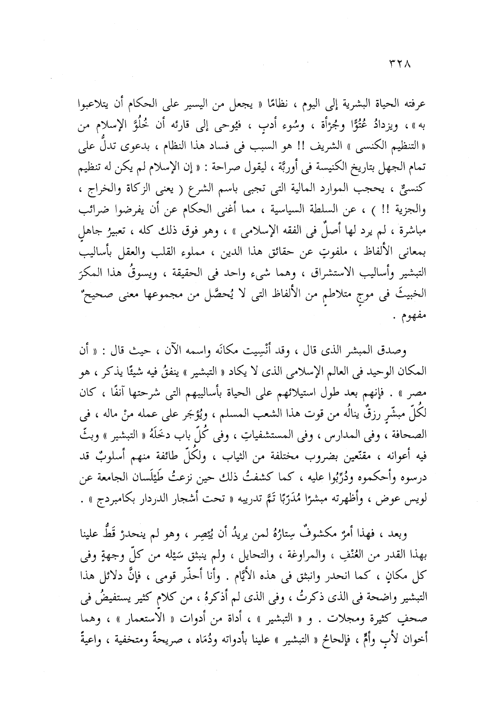 وبعد فهذا أمر مكشوف ستاره لمن يريد ان يبصر وهو لم ينحدر قط علينا بهذا القدر من العنف والمراوغة والتحايل ولم ينبثق سيله من كل وجهه وفي كل مكان كما اندر وانبثق في هذه الأيام وانا احذر قومى فان دلائل هذا التبشير واضحه في الذى ذكرت وفي الذى لم اذكرة من كلام كثير يستفيض في صحف كثيرة ومجلات والتبشير أداة من أدوات الاستعمار وهما أخوان لأب وأم، فإلحاحُ التبشير علينا بادواته ودُمَاه صريحة ومتخفية، واعية
