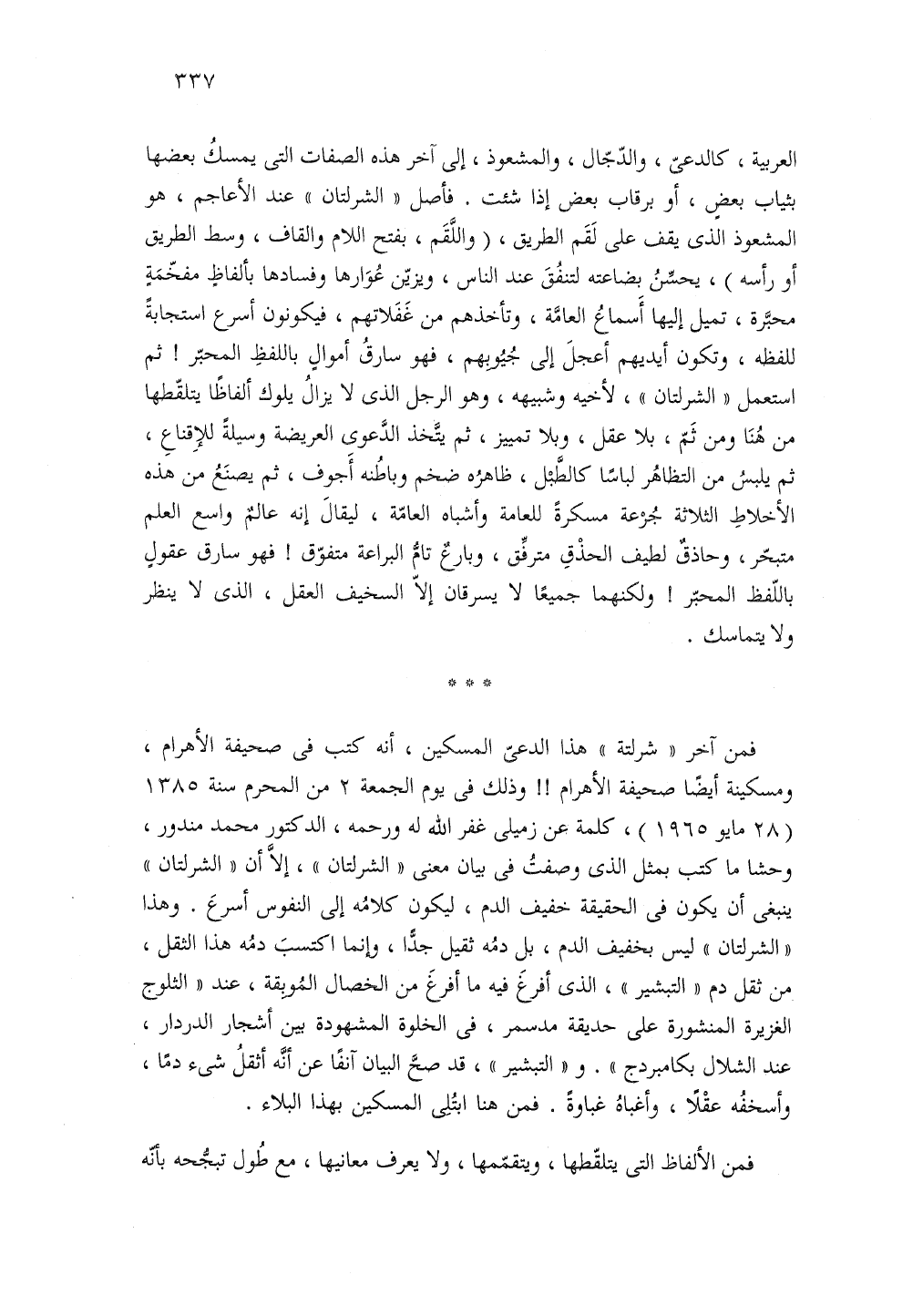 فمن آخر "شرلتة" هذا الدعى المسكين انه كتب في صحيفة الأهرام ومسكينه أيضًا صحيفة الأهرام وذلك في يوم الجمعه 2 من المحرم سنة 1385 28 مايو 1965 كلمه عن زميلى غفر الله له رحمه الدكتور محمد مندور وحشا ما كتب بمثل الذى وصفت في بيان معنى الشرلتان الا ان الشرلتان ينبغى ان يكون في الحقيقه خفيف الدم ليكون كلامه إلى النفوس اسرع وهذا الشرلتان ليس بخفيف الدم بل دمه ثقيل جدا وانما اكتسب دمه هذ الثقل من ثقل دم التبشير الذى افرغ فيه ما افرغ من الخصال الموبقه عند الثلوج الغزيرة المنشورة على حديقه مدسمر في الخلوه المشهودة بين اشجار الدردار عند الشلال بكامبردج والتبشير قد صح البيان انفا عن انه اثقل شئ دما واسخفه عقلا واغباه غباوة فمن هنا ابتلى المسكين بهذا البلاء.