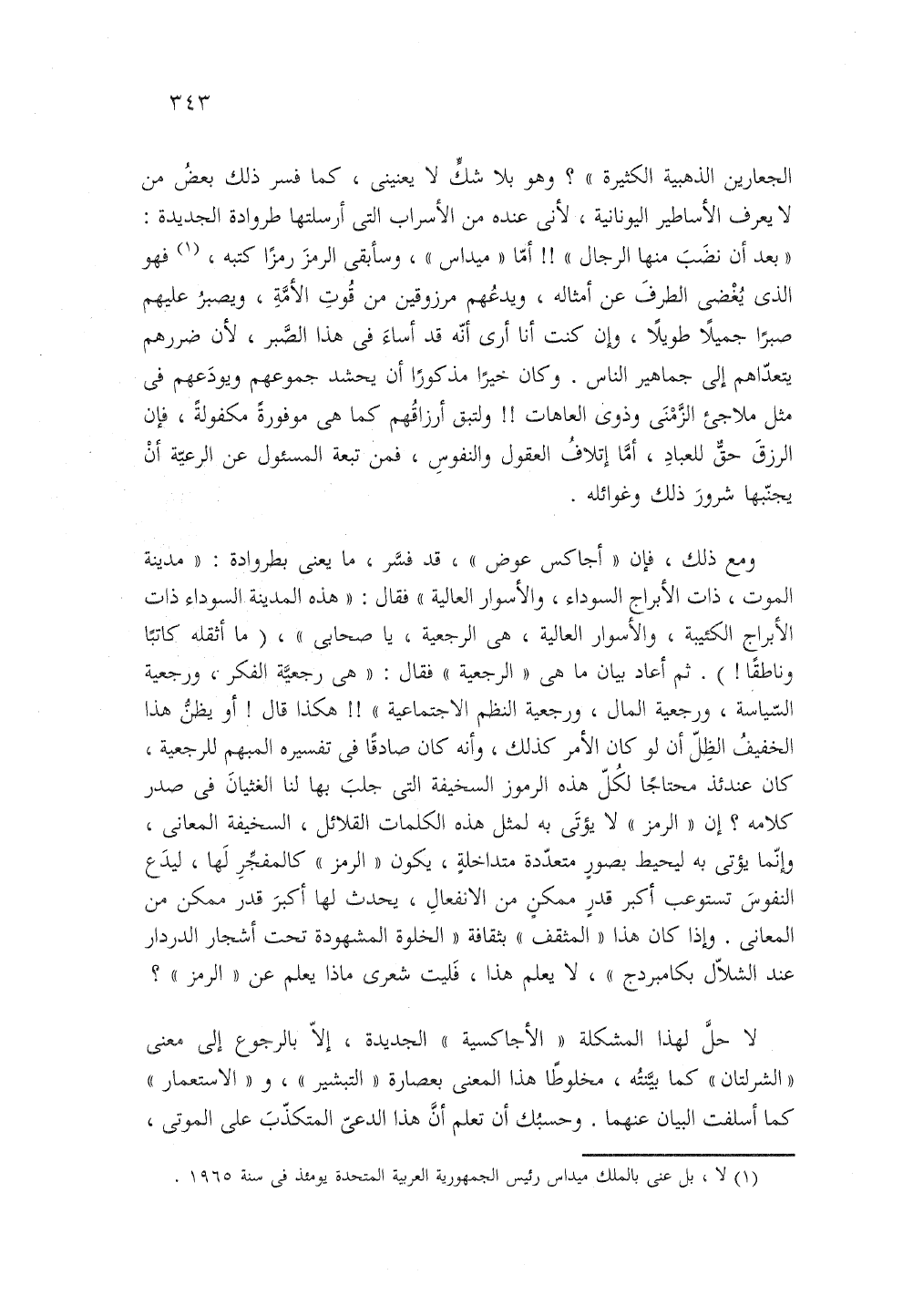 الجعارين الذهبية الكثيرة وهو بلا شك لا يعنينى كما فسر ذلك بعض من لا يعرف الاساطير اليونانية لانى عندة من الاسراب التي ارسلتها طراودة الجديدة بعد ان نضب منها الرجال اما ميداس وسابقى الرمز رمزا كتبه، (1) فهو الذى يغضى الطرف عن امثاله ويدعهم مرزوقين من قوت الأمة ويصبر عليهم صبرا جميلا طويلا وان كنت انا ارى انه قد اساء في هذا الصبر لان ضررهم يتعداهم إلى جماهير الناس وكان خيرا مذكورا ان يحشد جموعهم ويودعهم في مثل ملاجئ الزمنى وذوى العاهات ولتبق ارزاقهم كما هي موفورة مكفوله فان الرزق حق العباد اما اتلاف العقول والنفوس فمن تبعه المسؤل عن الرعية ان يجنبها شرور ذلك وغوائله.