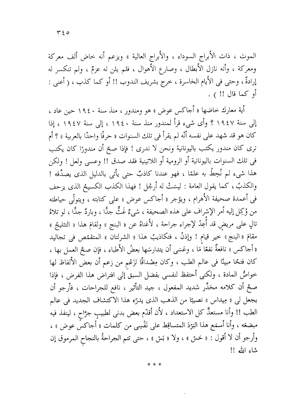 أية معارض خاضها أجاكس عوض هو مندور منذ سنة 1940 حين عاد إلى سنة 1947 واى شئ قرأ لمندور منذ سنة 1940 إلى سنة 1947 إذا كان هو قد شهد على نفسه انه لم يقرا في تلك السنوات حرفا واحدا بالعربية ام ترى كان مندور يكتب باليونانية ونحن لا ندرى فاذا صح ان مندورا كان يكتب في تلك السنوات باليونانية أو الروميه أو اللاتينيه فقد صدق وعسى ولعل ولكن هذا شئ لم نحط به علما هفو كاذب حتى يأتى بالدليل الذى يصدقه والكذب كما يقول العامة ليست له ارجل فهذا الكذب الكسيح الذى يزحف في أعمدة صحيفة الأهرام ويؤجر أجاكس عوض على كتابته ويتولى حياطته من وكل اليه امر الاشراف على هذه الصحيفة شئ غث جدا وبارد جدا التثليج مقام البنج خير قيام واذن فتكاذيب هذا الشرلتان المتقمص في تجاليد أجاكس نافعه نفعا ما وعسى ان يتدارسها بعض الاطباء فان صح العمل بها كان فتحا مبينا في عالم الطب وكان مصداقا لزعم من زعم ان بعض الألفاظ لها خواص المادة ولكنى احتفظ لنفسى بفضل لسبق إلى افتراض هذا الفرض فاذا صح ان كلامه مخدر شديد المفعول جيد التاثير نافع للجراحات فارجو ان يجعل لى ميداس نصيبا من الذهب الذى يدرة هذا الاكتشاف الجديد في عالم الطب وانا مستعد كل الاستعداد لان اقدم بعض بدنى لطبيب جراح لينفذ فيه مبضعه وانا اسمع هذا البرد المتساقط على نفسى من كلمات أجاكس عوض وأرجو أن لا اقول حس ولا (بَسْ) حتى الجراجة بالنجاح المرموق إن شاء الله!!