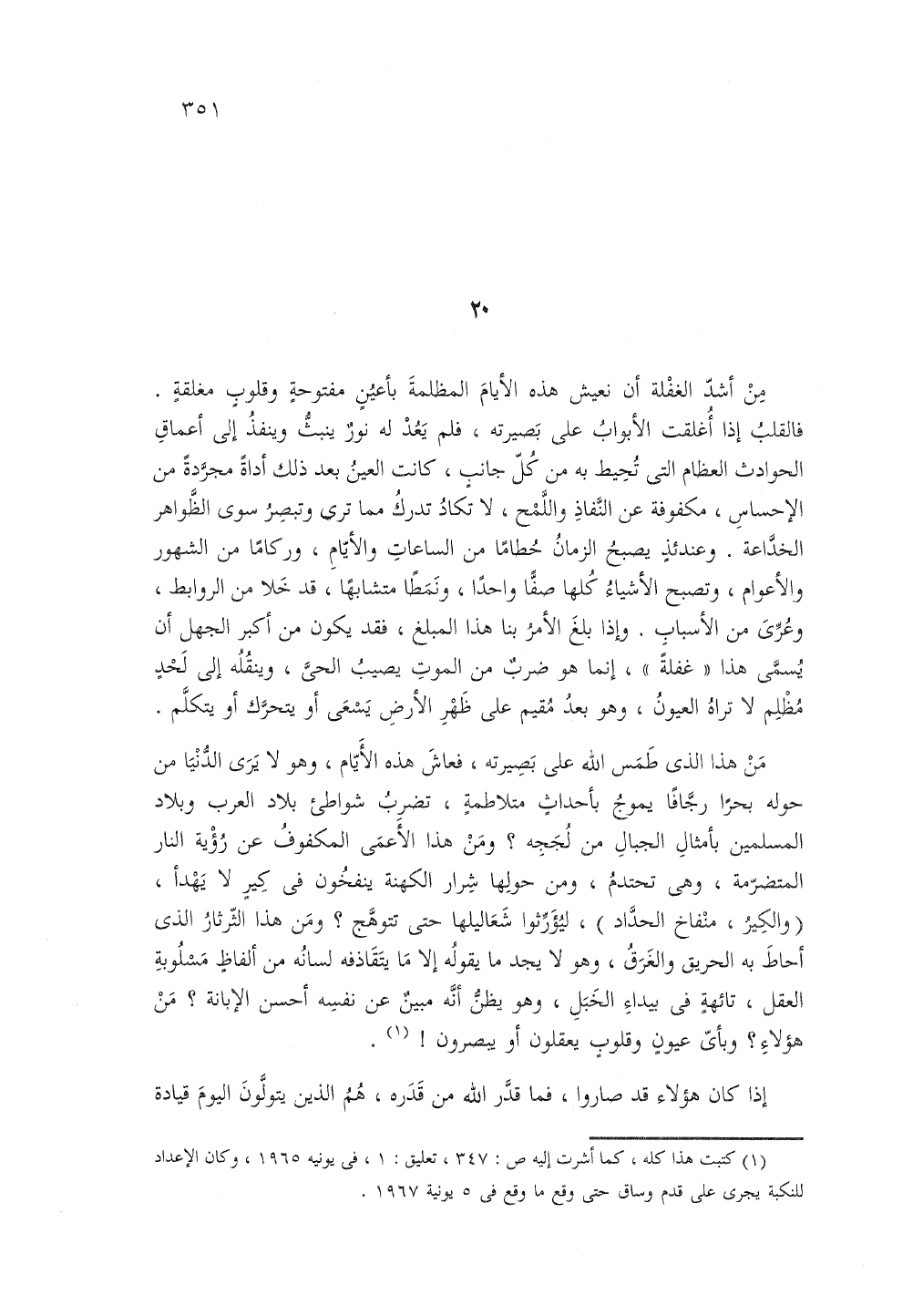من هذا الذى طمس الله على بصيرته فعاش هذه الأيام وهو لا يرى الدنيا من حوله بحرا رجافا يموج باحداث متلاطمه تضرب شواطئ بلاد العرب وبلاد المسلمين بامثال الجبال من لججه ومن هذا الاعمى المكفوف عن رؤيه النار المتضرمه وهى تحتدم ومن حولها شرار الكهنه ينفخون في كير لا يهدأ والكير منفاخ الحداد ليؤرثوا شعاليلها حتى تتوهج ومن هذا الثرثار الذى احاط به الحريق والغرق وهو لا يجد ما يقوله الا ما يتقاذفه لسانه من ألفاظ مسلوبه العقل تائهه في بيداء الخبل وهو يظن انه مبين عن نفسه احسن الابانه من هؤلاء وباى عيون وقلوب يعقلون أو يبصرون! (1).