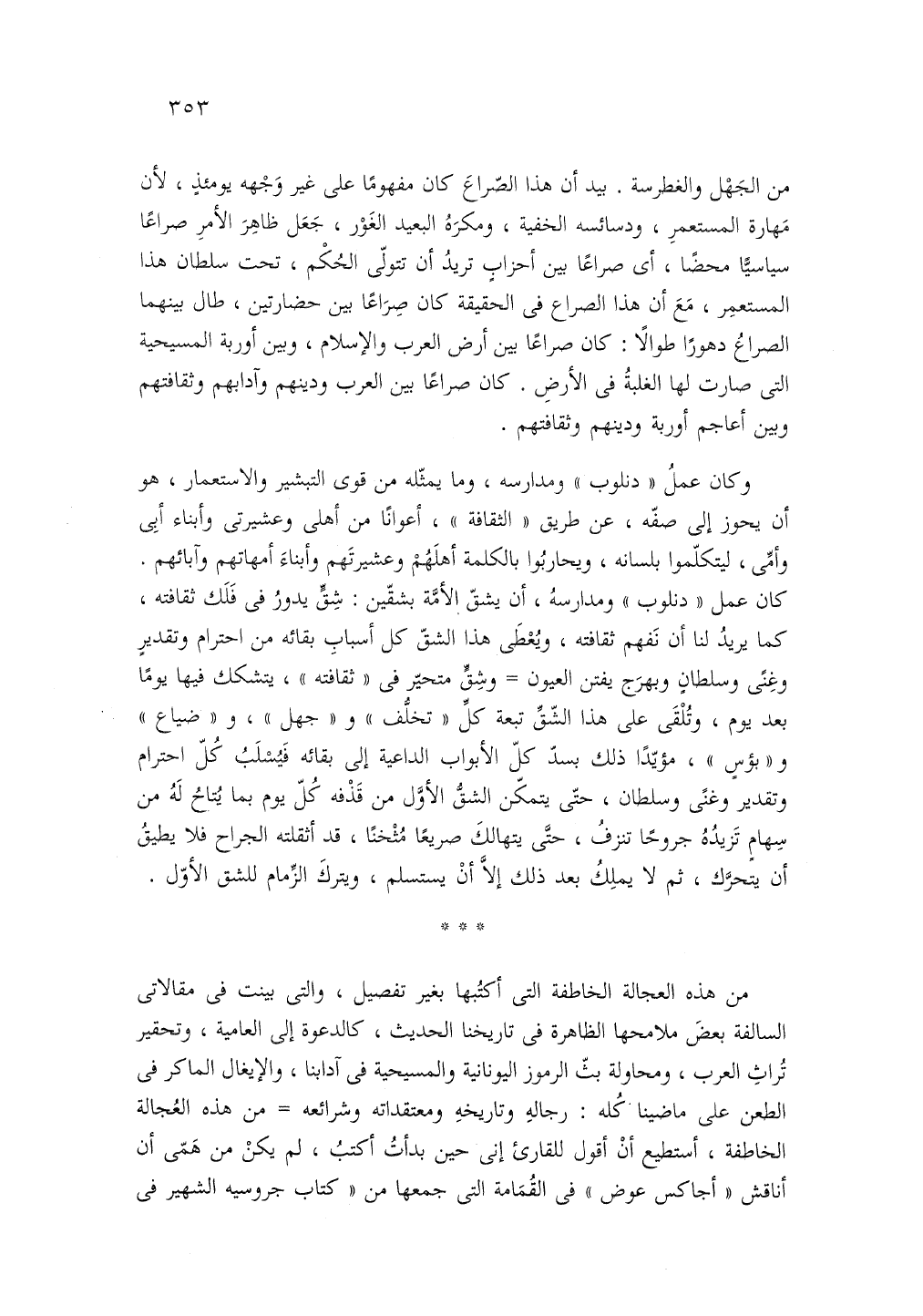 من هذه العجالة الخاطفة التي اكتبها بغير تفاصيل والتى بينت في مقالاتى السالفه بعض ملامحها الظاهرة في تاريخنا الحديث كالدعوه إلى العامية وتحقير تراث العرب ومحاوله بث الرموز اليونانية والمسيحية في ادابنا والابغال الماكر في الطعن على ماضينا كله رجاله وتاريخه ومعتقداته وشرائعه من هذه العجالة الخاطفة استطيع ان اقول للقارئ انى حين بدأت أكتب لم يكن من همي ان اناقش أجاكس عوض في القمامة التي جمعها من "كتاب جروسيه الشهير في