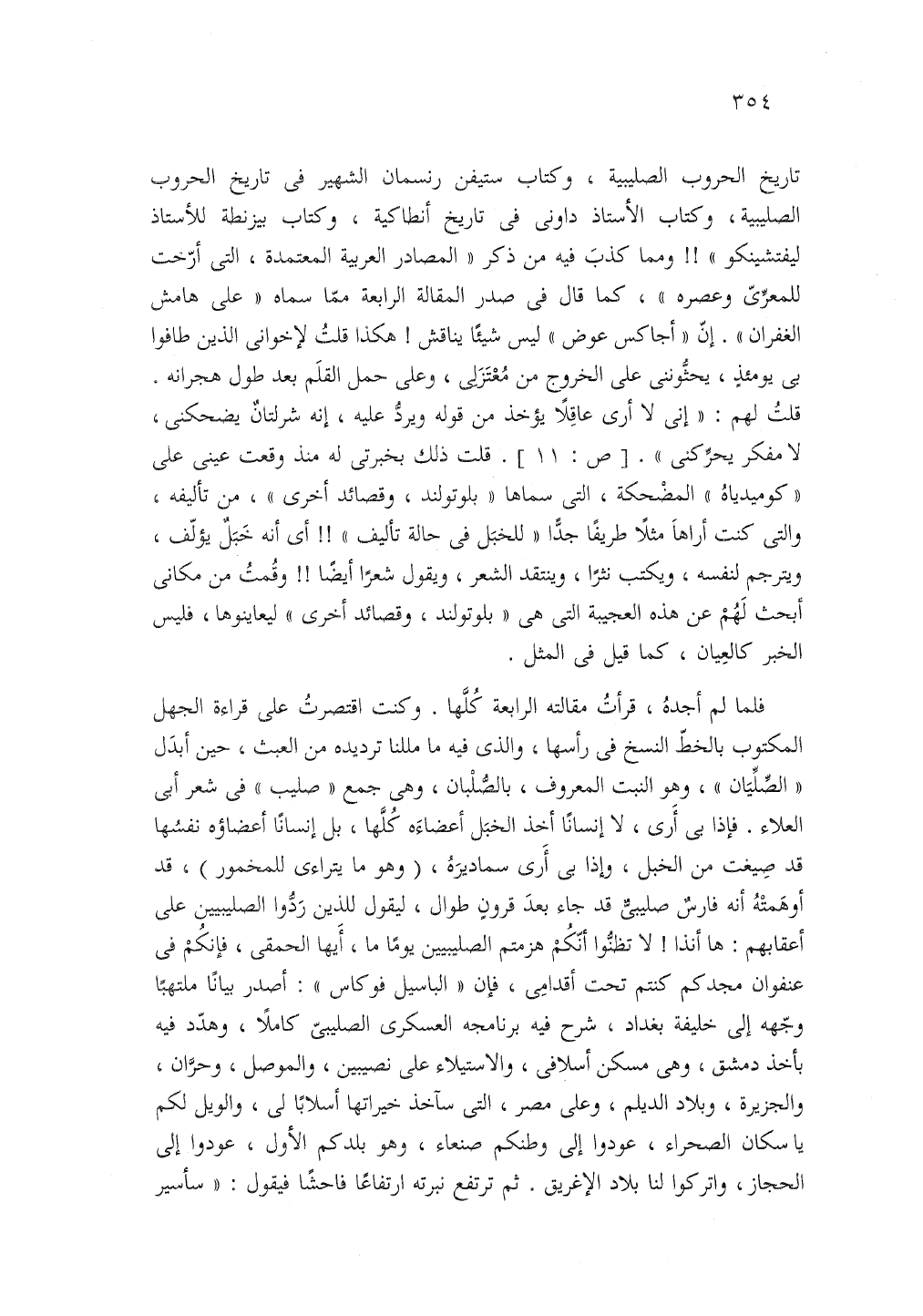فلما لم اجدة قرات مقالته الرابعه كلها وكنت اقتصرت على قراءة الجهل المكتوب بالخط النسخ في راسها والذى فيه ما مللناه ترديدة من العبث حين ابدل الصليان وهو النبت المعروف بالصلبان وهى جمع صليب في شعر ابى الصليان وهو النبت المعروف بالصلبان وهى جمع صليب في شعر ابىلعلاء فاذا بى ارى لا انسانا اخذ الخبل اعضاءه كلها بل انسانا اعضاؤه نفسها قد صيغت من الخبل واذا بى ارى سماديره وهو ما يتراءى للمخمور قد اوهمته انه فارس صليبى قد جاء بعد قرون طوال ليقول للذين ردوا الصلييين على اعقابهم ها انذا لا تظنوا انكم هزمتهم الصليبيين يوما ما ايها الحمقى فانكم في عنفوان مجدكم كنتم تحت اقدامى فان الباسيل فو كاس اصدر بيانا ملتهبا وجهه إلى خليفه بغداد شرح فيه برنامجه العسكرى الصليبى كاملا وهدد فيه باخد دمشق وهى مسكن اسلافى والاستيلاء على مصيبين والموصل وحران والجزيرة وبلاد الديلم وعلى مصر التي ساخذ خيراتها اسلابا لى والويل لكم يا سكان الصحراء عودوا إلى وطنكم سنعاء وهو بلدكم الأول عودوا إلى الحجاز واتركوا لنا بلاد الاغريق ثم ترتفع نبرته ارتفاعا فاحشا فيقول سأسير